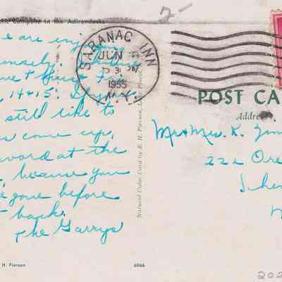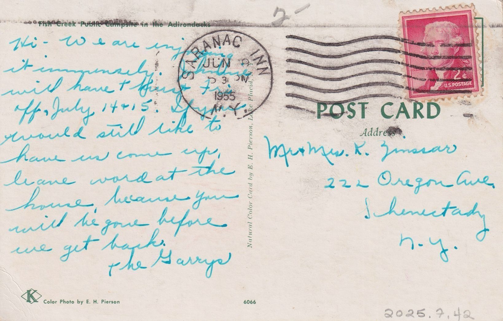 Handwritten message on reverse reads, "Hi - we are enjoying it immensely. Johnnie will have + [?] Fri off, July 14+15. If you would still like to have us come up, leave word at the house, because you will be gone before we get back. The Garrys." Mailed to Mr. & Mrs. K. Zinssar, 222 Oregon Ave., Schenectady, NY.Subject Place