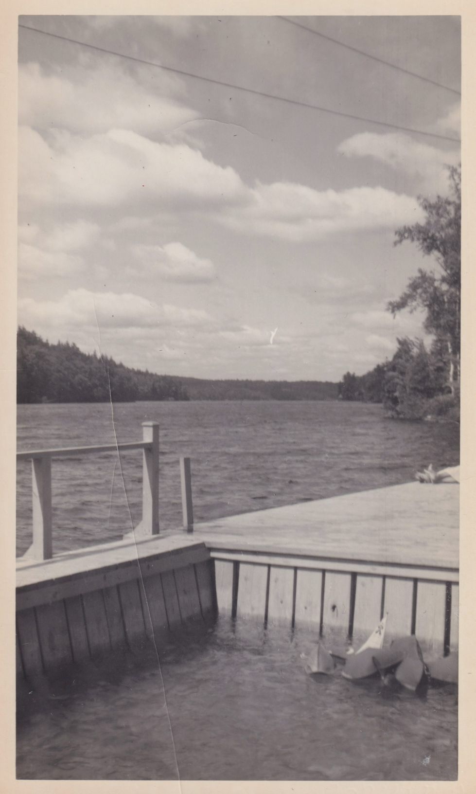 Black-and-White photograph of the edge of the lakeside "pool" at Pyramid Camp (AKA Bartlett Carry Club). The lake can be seen on the other side of the dock.