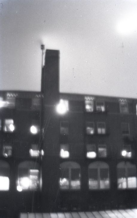 Blurry negative of a four-story brick building with lines of windows on each floor. There is a stairwell or elevator shaft on the side of the building, standing taller than the roof. Most likely taken by Mary Ives Baldwin. This item is not fully cataloged but has been uploaded so the image is publicly available; if you would like us to prioritize cataloging this item, please contact the HSL Collections team.