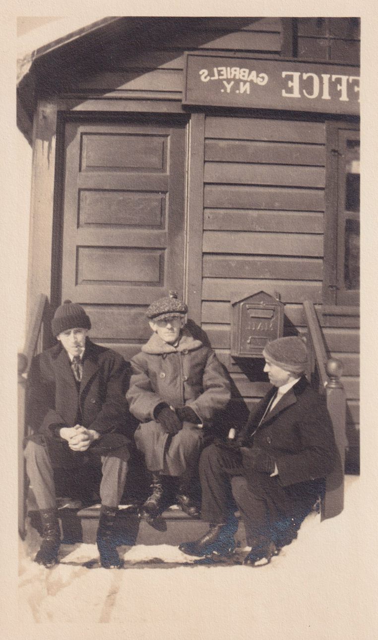 Black-and-White photograph of three men seated on the steps of a small building. The photograph appears to have been printed backwards. There is a sign on the building that reads, "...Office, Gabriels, N.Y." This may be the Post Office. There is snow on the ground. The photograph was likely printed by Kollecker's Kodak and Gift Shop.Lexicon
