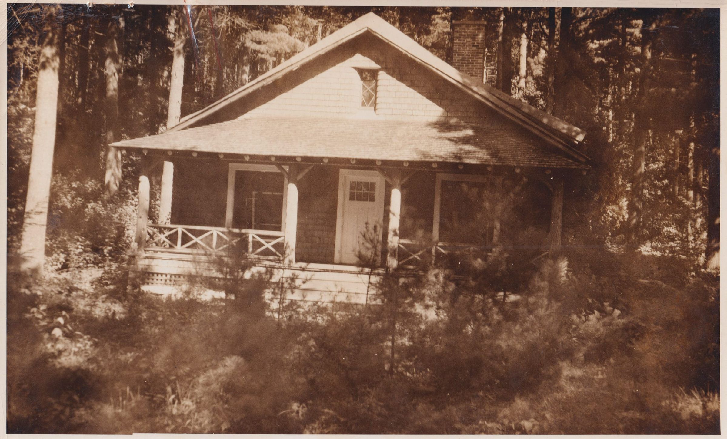 Black-and-White photograph of the front of Cedar Cottage at Bartlett Carry Club. Was attached to a floor plan of the cottage [2024.57.111].