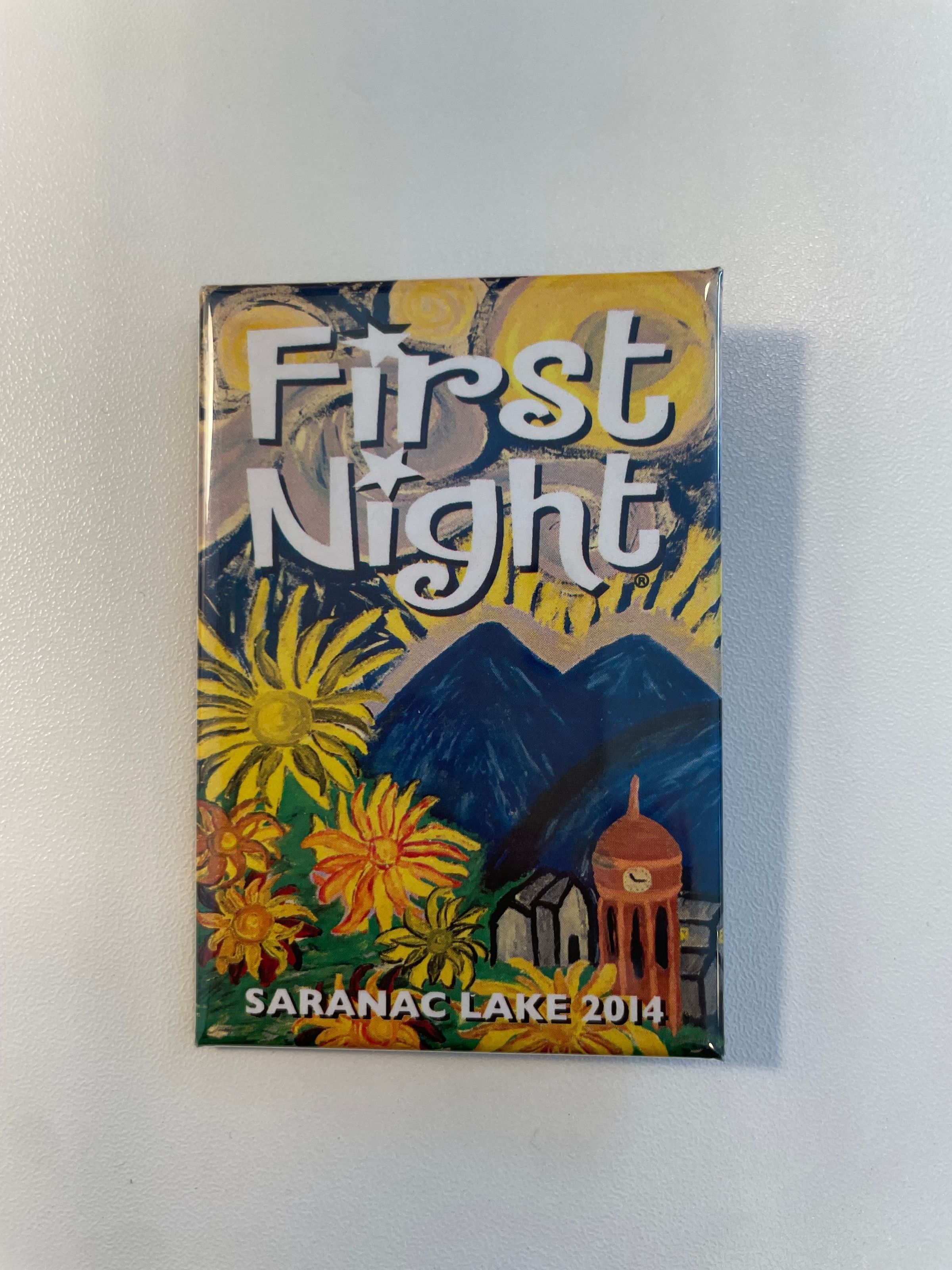 Pin from First Night 2014. Pin has an illustration of flowers, mountains, and the Harrietstown Town Hall in the style of Van Gogh.