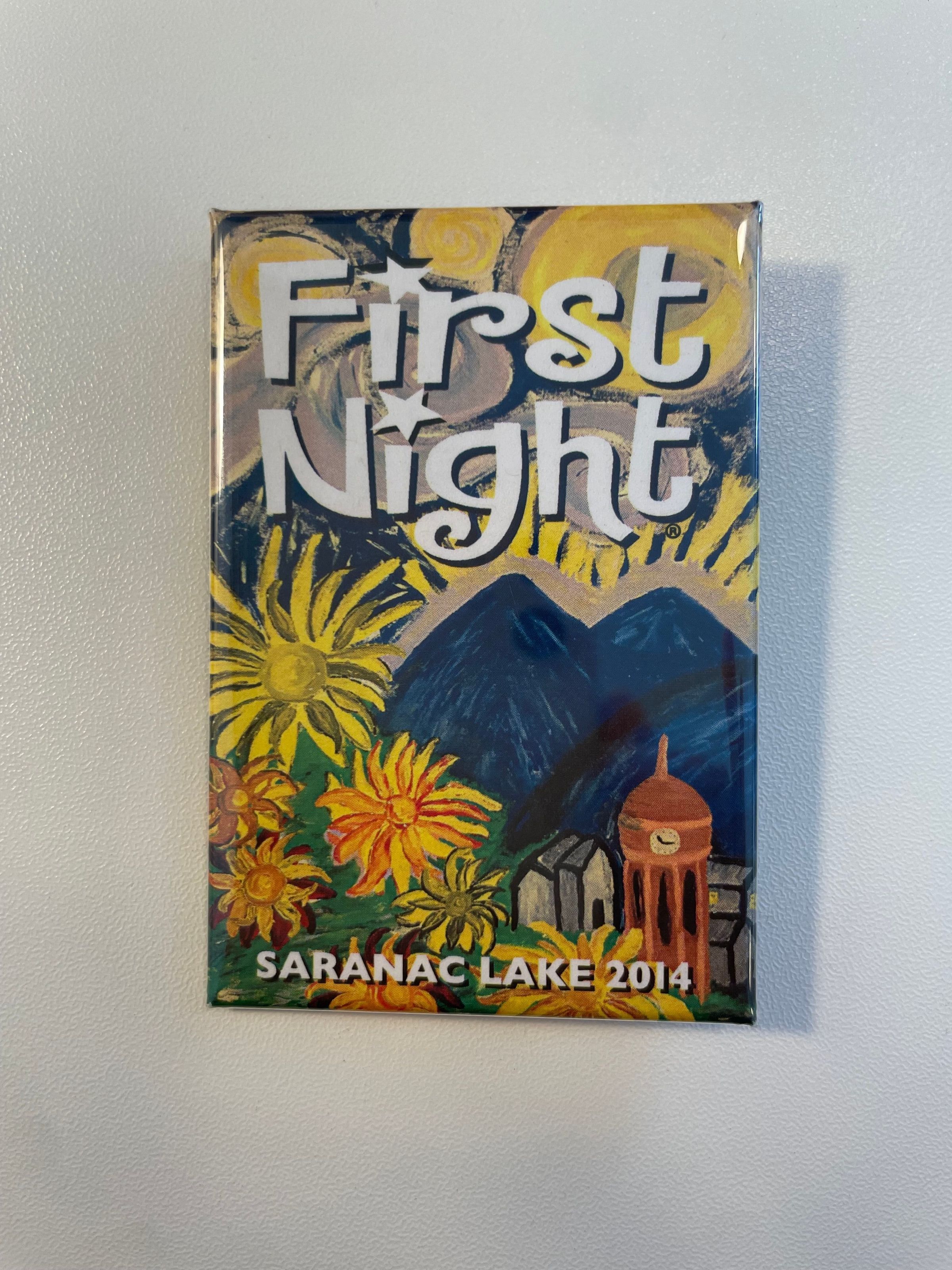 Pin from First Night 2014. Pin has an illustration of flowers, mountains, and the Harrietstown Town Hall in the style of Van Gogh.