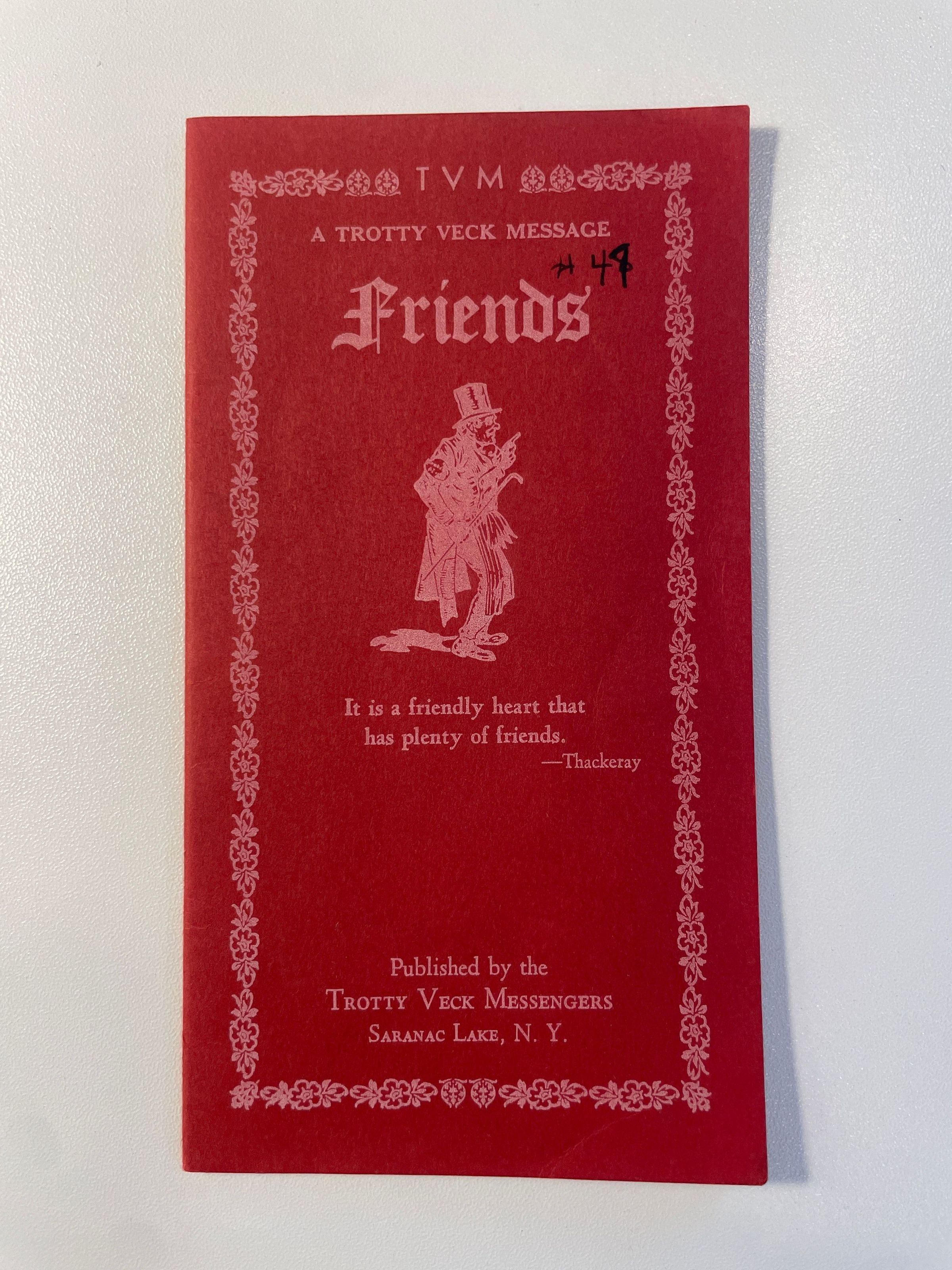 Trotty Veck Message: Friends. Printed in 1958. Handwritten note on front reads, "#47." Physical Description: Softcover. 3.25" w x 6" h. Red cover with white ink.