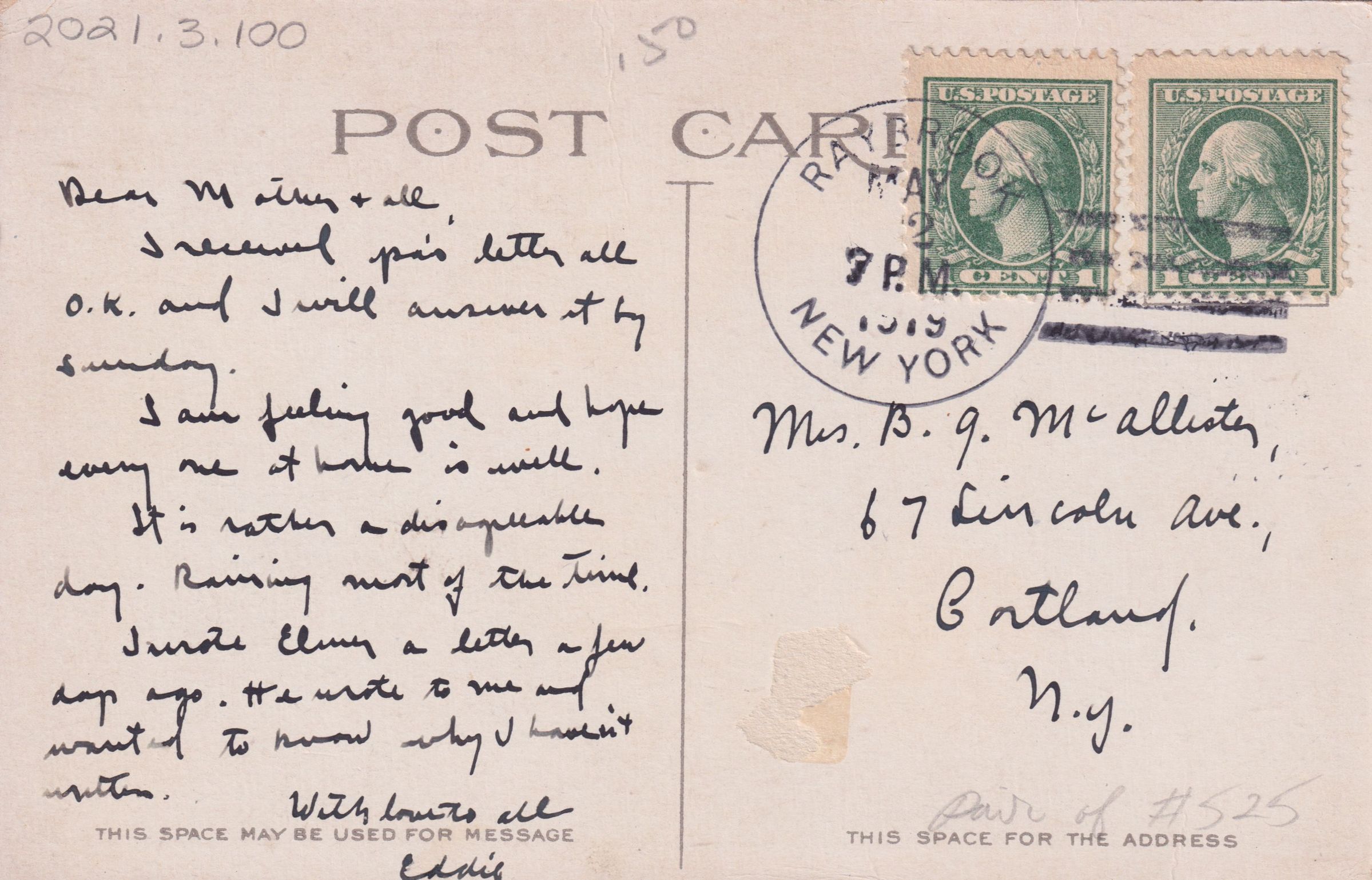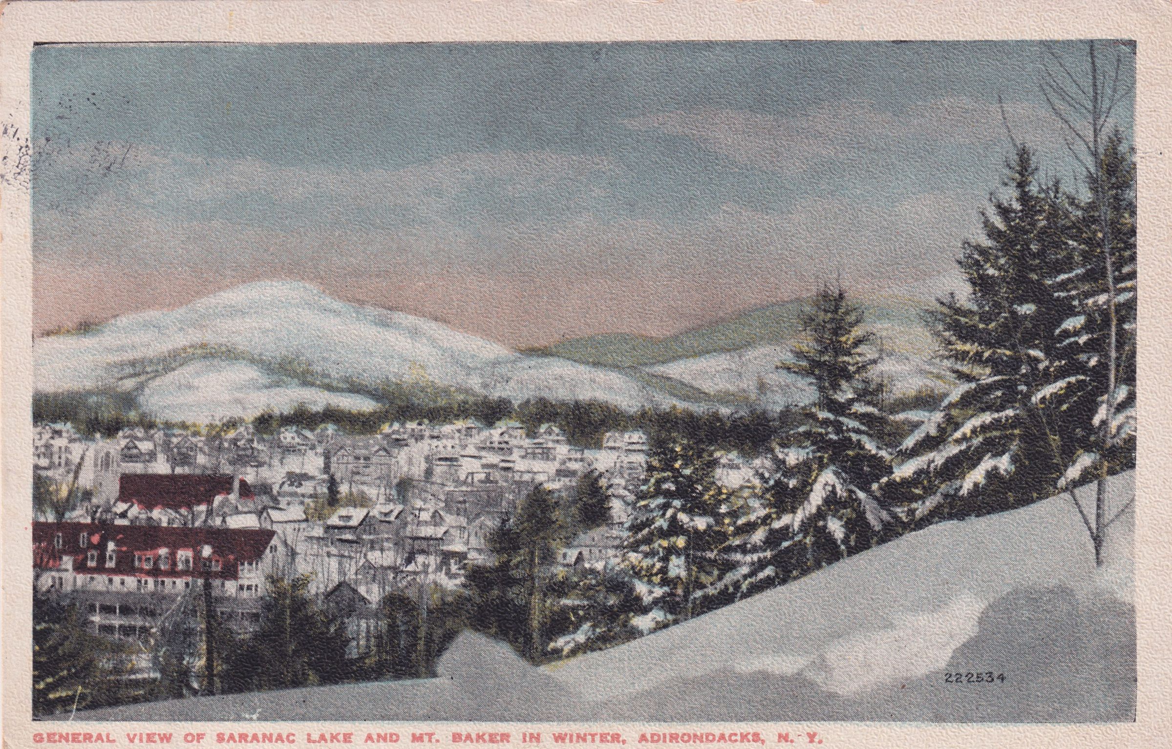 Color postcard showing an elevated view of Saranac Lake in the snow from Blood Hill. Printed caption on the front reads, "General View of Saranac Lake and Mt. Baker in Winter, Adirondacks, N.Y." Used, divided back, white border, postmarked Ray Brook, NY, May 2, 1919. No printer's mark. Handwritten message on the back reads, "Dear Mother and all, I received pa's letter all ok and I will answer it by Sunday. I am feeling good and hope everyone at home is well. It is rather a disagreeable day, raining most of the time. I wrote Elmer a letter a few days ago. He wrote to me and wanted to know why I hadn't written. With love to all, Eddie." Mailed to Mrs. B. G. McAllister, 67 Lincoln Ave., Cortland, NY.Subject Place