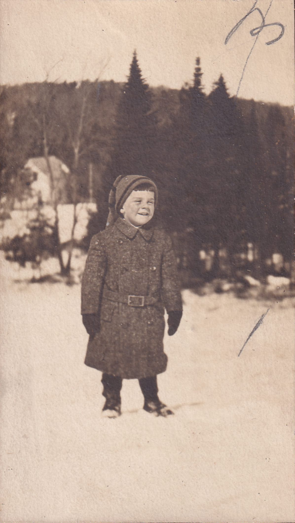 Black-and-White photograph showing a young boy standing in the snow. He is wearing a winter coat and knit hat. Handwritten note on reverse reads, "Geo. Francis Leis, Saranac Lake, N.Y., February 1906."