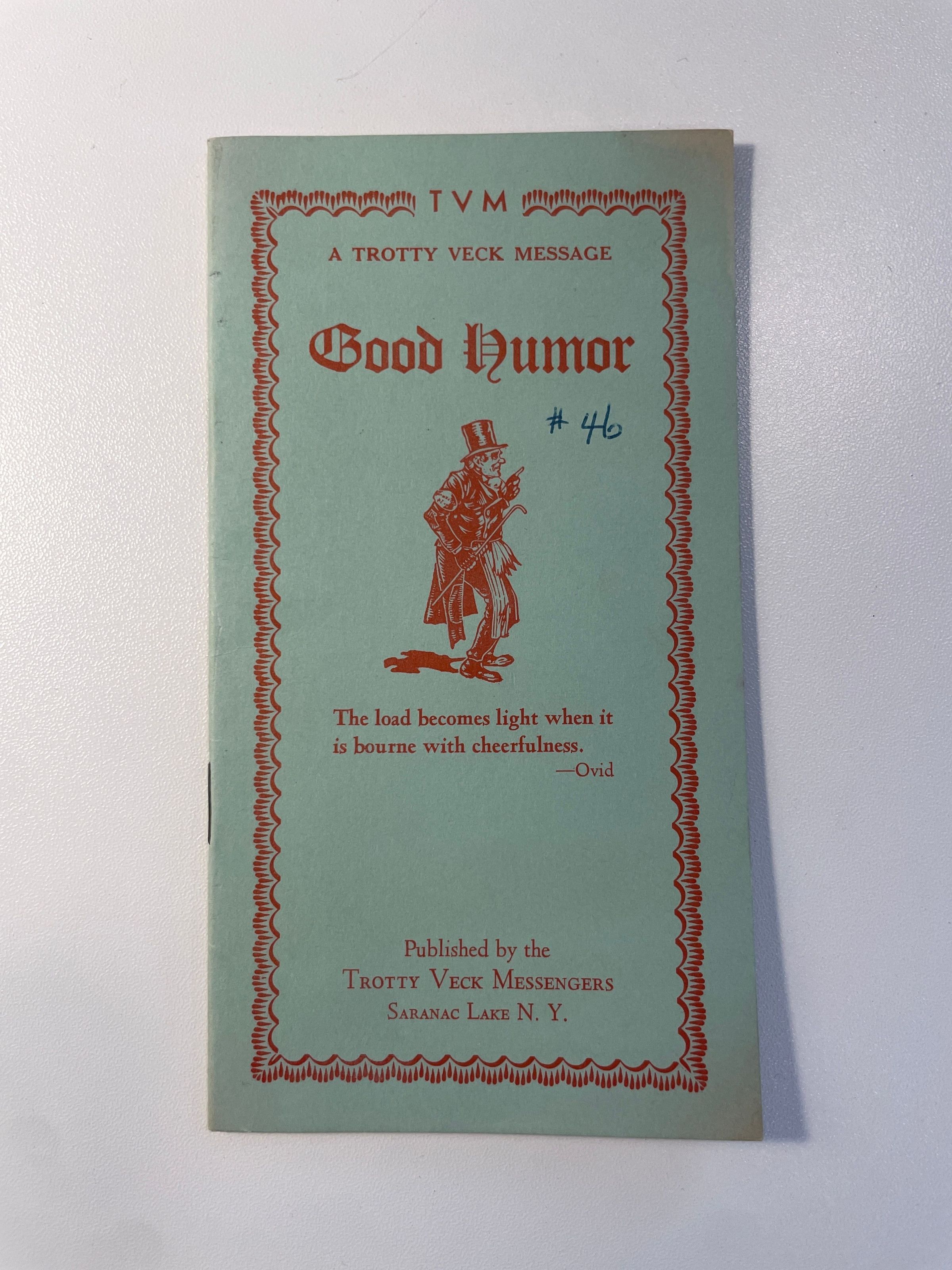 Trotty Veck Message: Good Humor. Printed in 1957. Handwritten note on front reads, "#46." Physical Description: Softcover. 3.25" w x 6" h. Light green cover with orange ink.