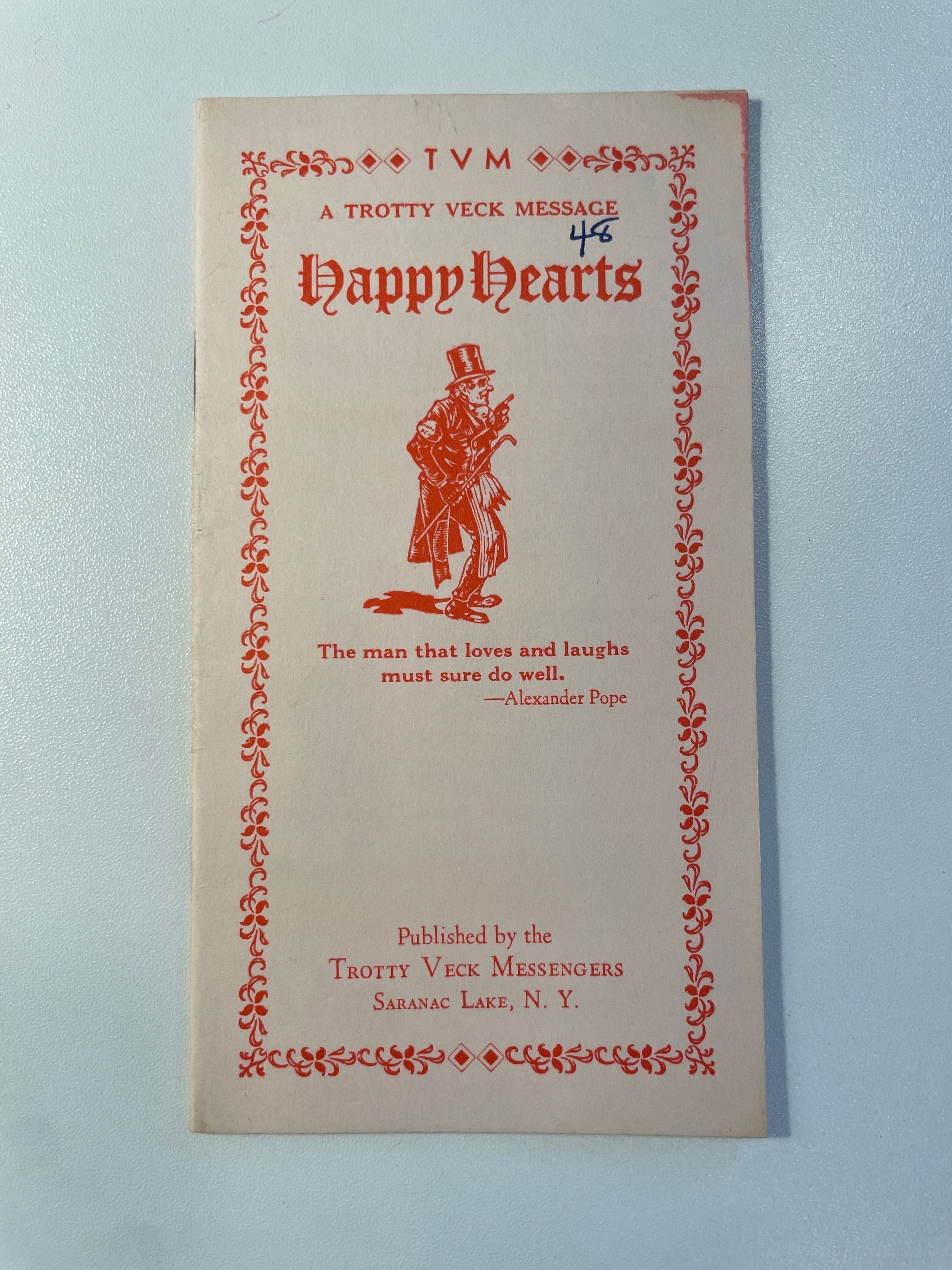 Trotty Veck Message: Happy Hearts. Printed in 1959. Handwritten note on front reads, "#48." Physical Description: Softcover. 3.25" w x 6" h. Light orange cover with orange ink.