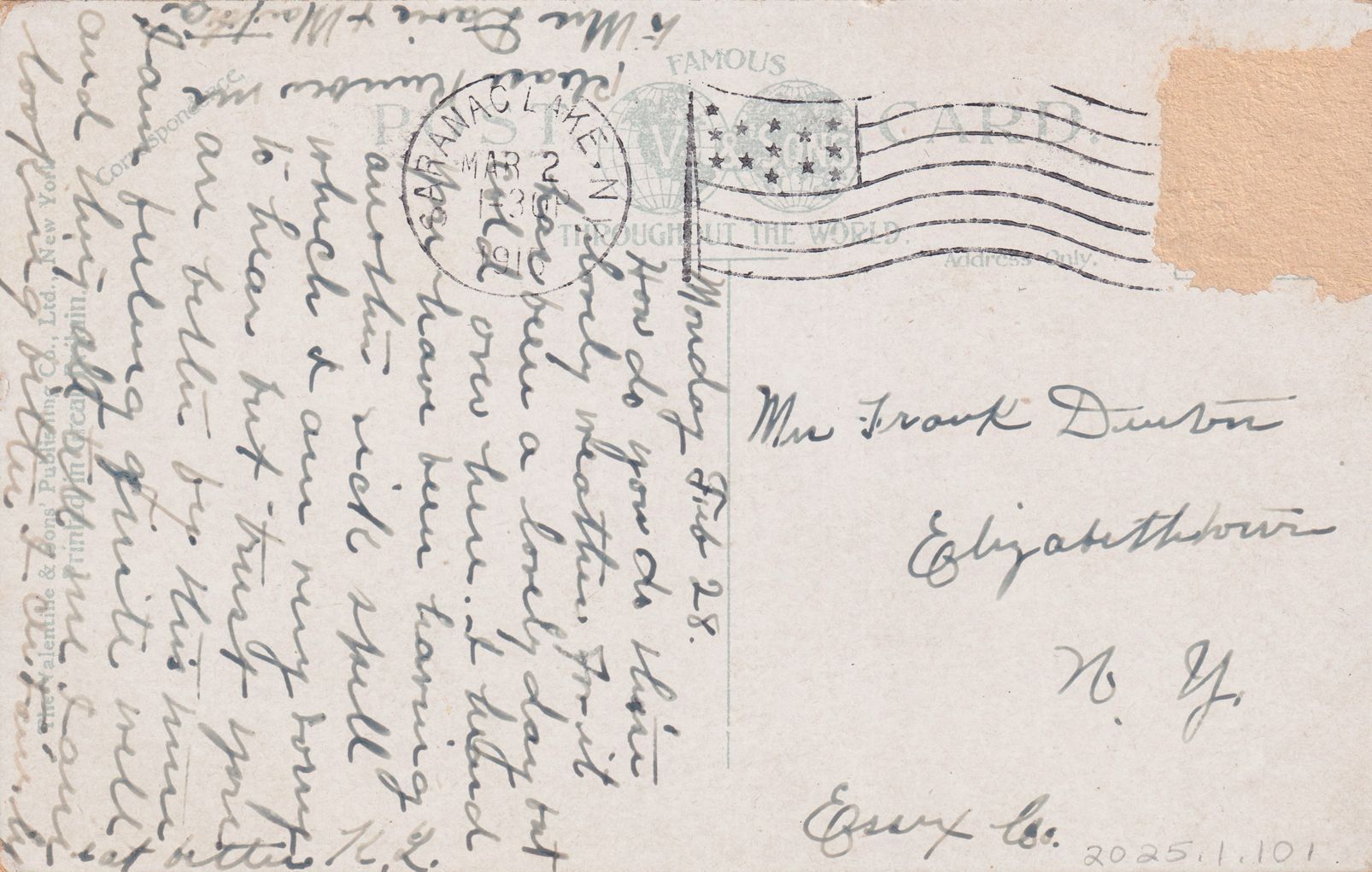 Handwritten message on reverse reads, "Monday Feb. 28. How do you do [?] lovely weather for it has been a lovely day but cold over here. I heard you have been having another sick spell which I am very sorry to hear but trust you are better by this time. I am feeling quite well and they all tell me I am looking better. I am [?] eat better K. L. Please remember me to Mrs. Davis & Matilda." Mailed to Mrs. Frank Distin [?], Elizabethtown, NY, Essex Co.Subject Place
