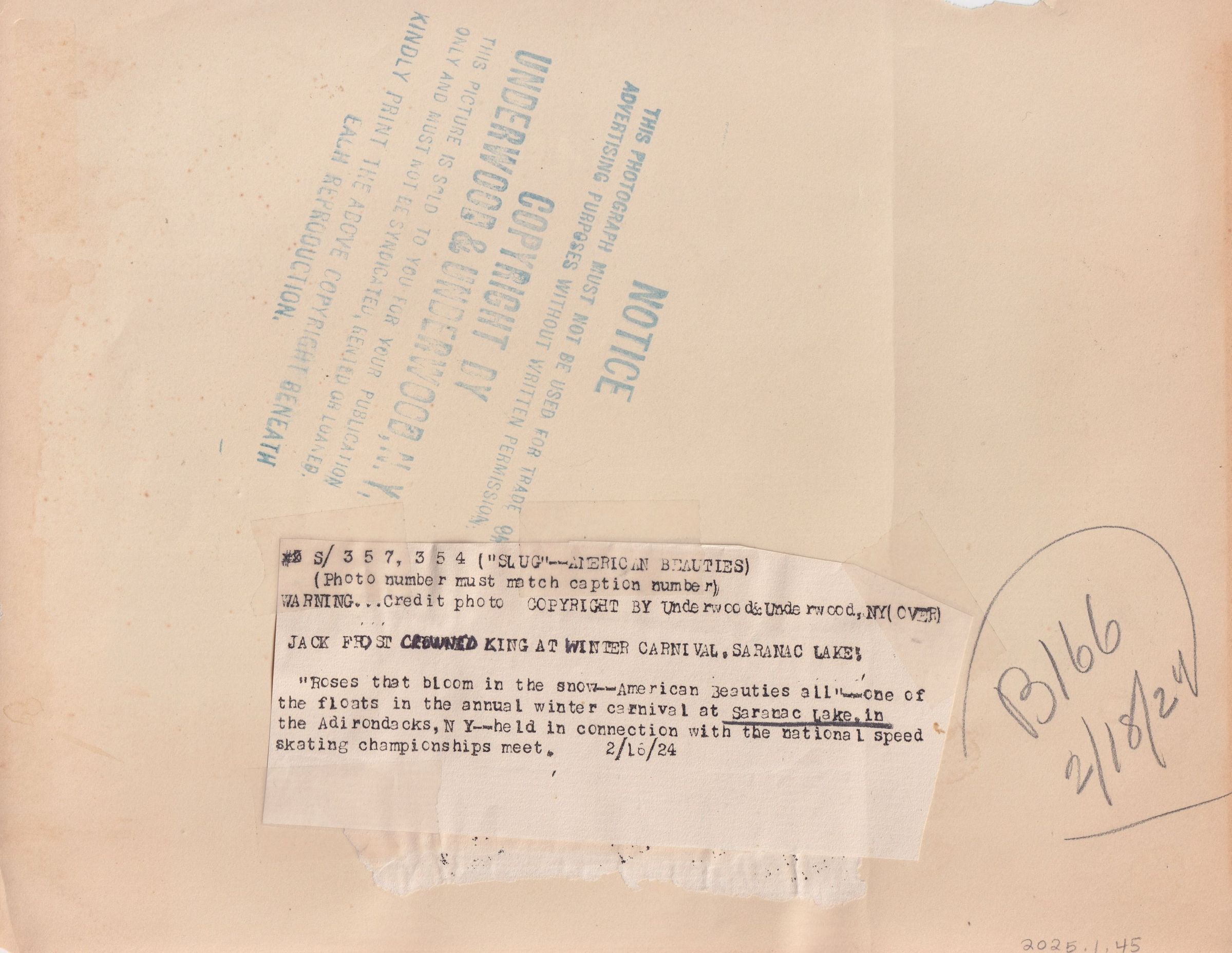 Black-and-White photograph showing floats in the 1924 Winter Carnival parade coming up Broadway between the Saranac River and Main Street. A horse-drawn float with children in white dresses and bonnets is at center. People and cars can be seen lining the street. Photograph by Underwood & Underwood, NY. Caption taped to reverse reads, "Jack Frost Crowned King at Winter Carnival, Saranac Lake: 'Roses that bloom in the snow--American Beauties all--one of the floats in the annual winter carnival at Saranac Lake, in the Adirondacks, NY--held in connection with the national speed skating championships meet. 2/16/24."Photograph Details