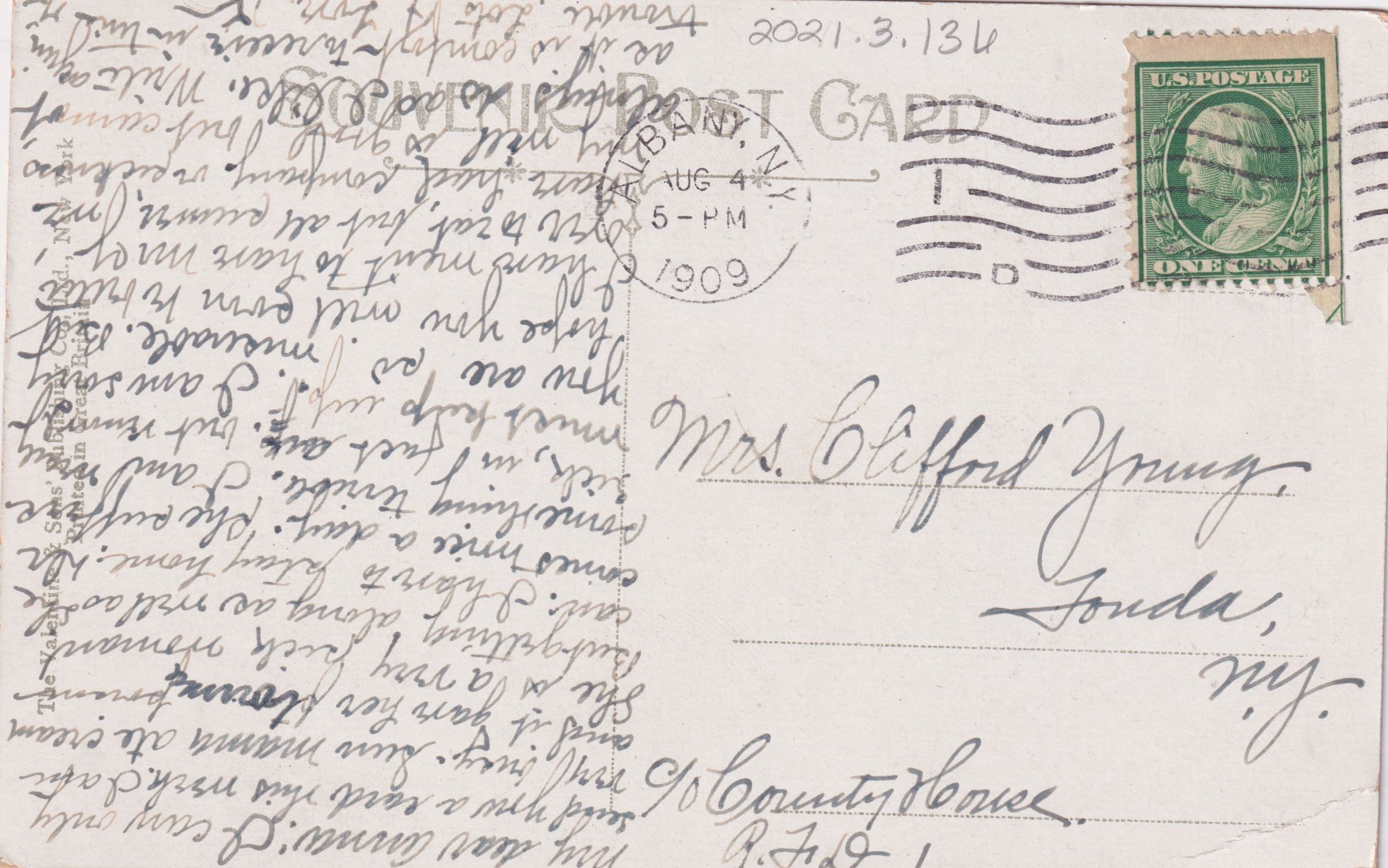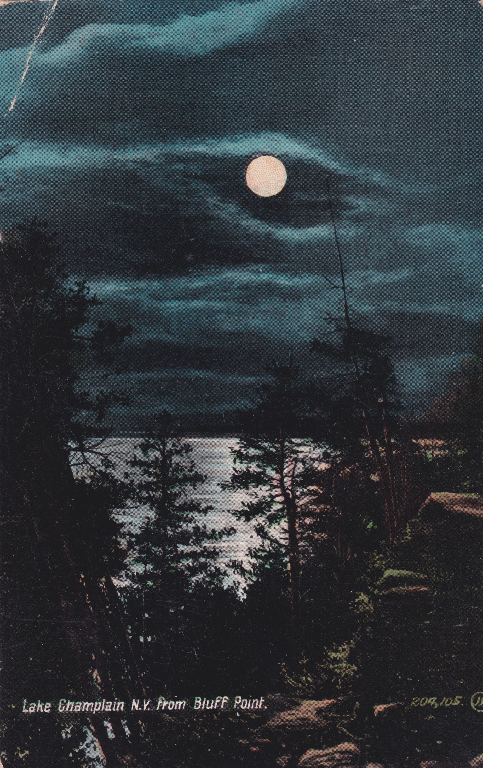 Color postcard showing a full moon over a tree-lined body of water. Printed caption on front reads, "Lake Champlain N. Y. from Bluff Point." Used, divided back, postmarked Albany, NY, August 4, 1909. Printed by the Valentine & Sons' Publishing Co., Ltd., New York. Handwritten message on back reads, "My dear Anna: I can only send you a card this week. I am very busy. Sun Mama ate cream and it gave her [?] poison. She is a very sick woman but getting along as well as she can. I have to stay home. Dr. comes twice a day. She suffers something terrible. I am really[?] sick, in fact awf but know I must keep up. I am sorry you are so miserable. But hope you will soon be better. I have ment to have Mary over to eat[?] but all summer we have had company or sickness. My will is good but cannot always do as I like. Write again as it is comfort to receive in times of trouble. Lots of love, [?]." Mailed to Mrs. Clifford Young, Fonda, NY, c/o County House, R.F.D. 1."Subject Place