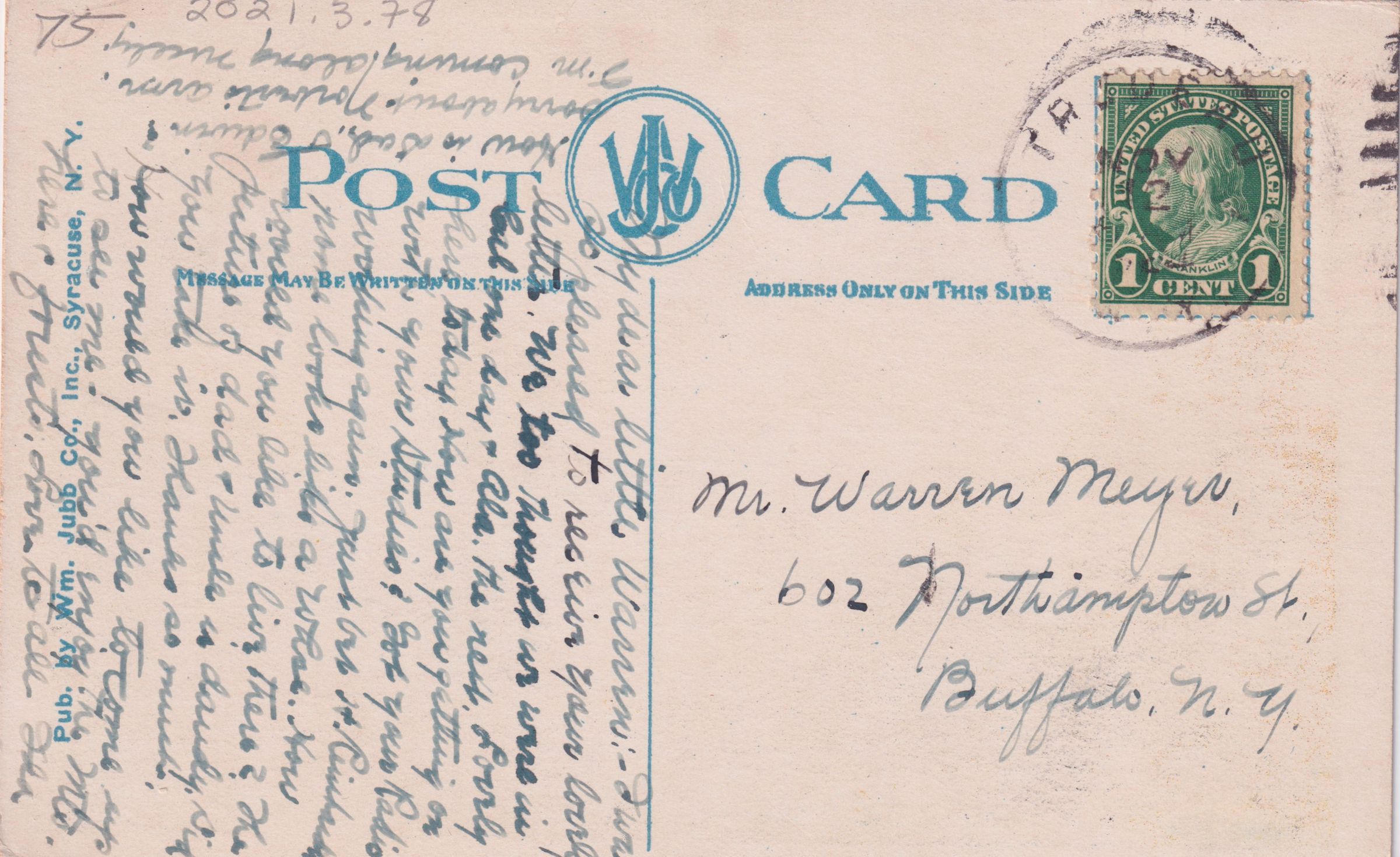 Color postcard showing the view east over Lake Flower. Some buildings along the shore are visible on the north side of the lake, and there is a small guideboat or canoe in the water. Printed caption on the front reads, "Lake Flower, Saranac Lake, Adirondacks, N.Y." Used, divided back, postmarked November 2, 1924. Printed by Wm. Jubb Co., Inc., Syracuse, NY. Handwritten message on the back reads, "My dear little Warren - I was so pleased to receive your lovely letter. We too thought we were in Cal one day and Ala the next. Lovely here today. How are you getting on with your studies and got your radio working again. ..... How would you like to live there? he picture of Dad - Uncle is dandy. Did you take it? Thanks so much. How would you like to come up and see me, you'd enjoy the mts. here. How is Dad and Edwin? Sorry about Norbert's arm. I'm coming along nicely. Love to you all. Ida." Mailed to Mr. Warren Meyer, 602 Northampton St., Buffalo, NY.Subject Place