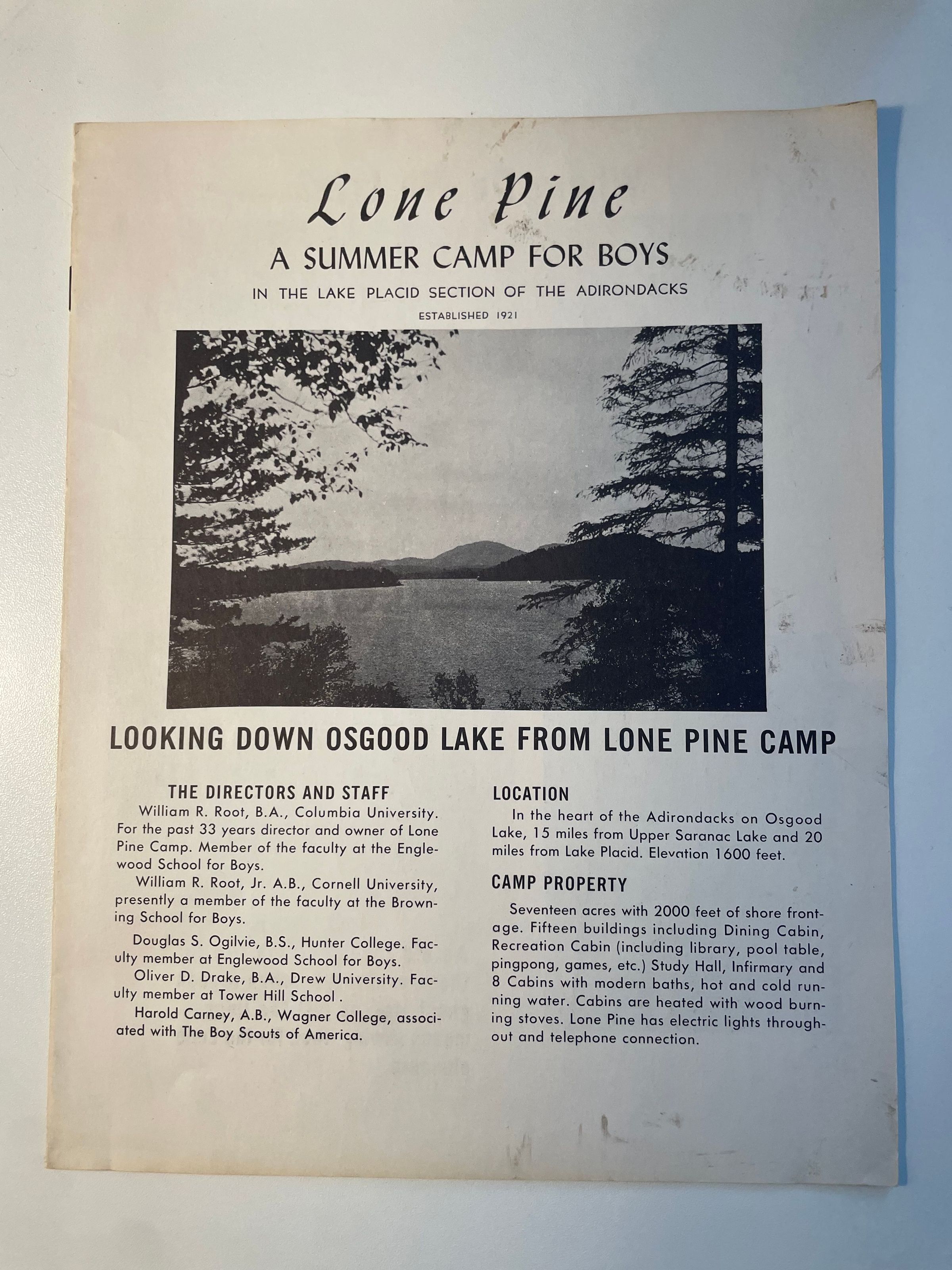 Booklet advertising Lone Pine Camp on Osgood Lake, c. 1954. Includes information about directors and staff, location, property, tuition, amenities, and more. Includes photographs of camp facilities and campers, as well as a list of recent Lone Pine attendees.Lexicon