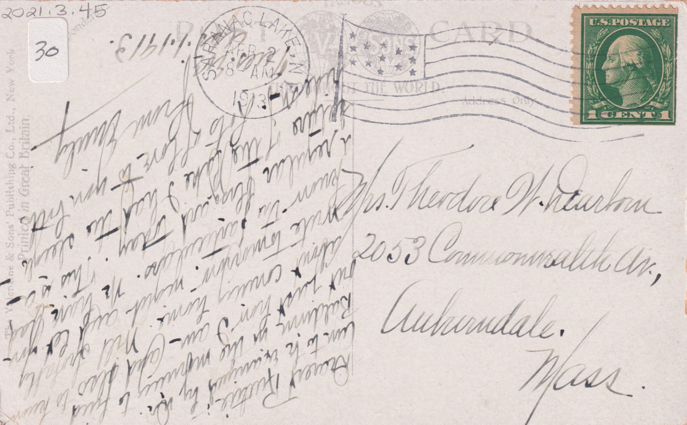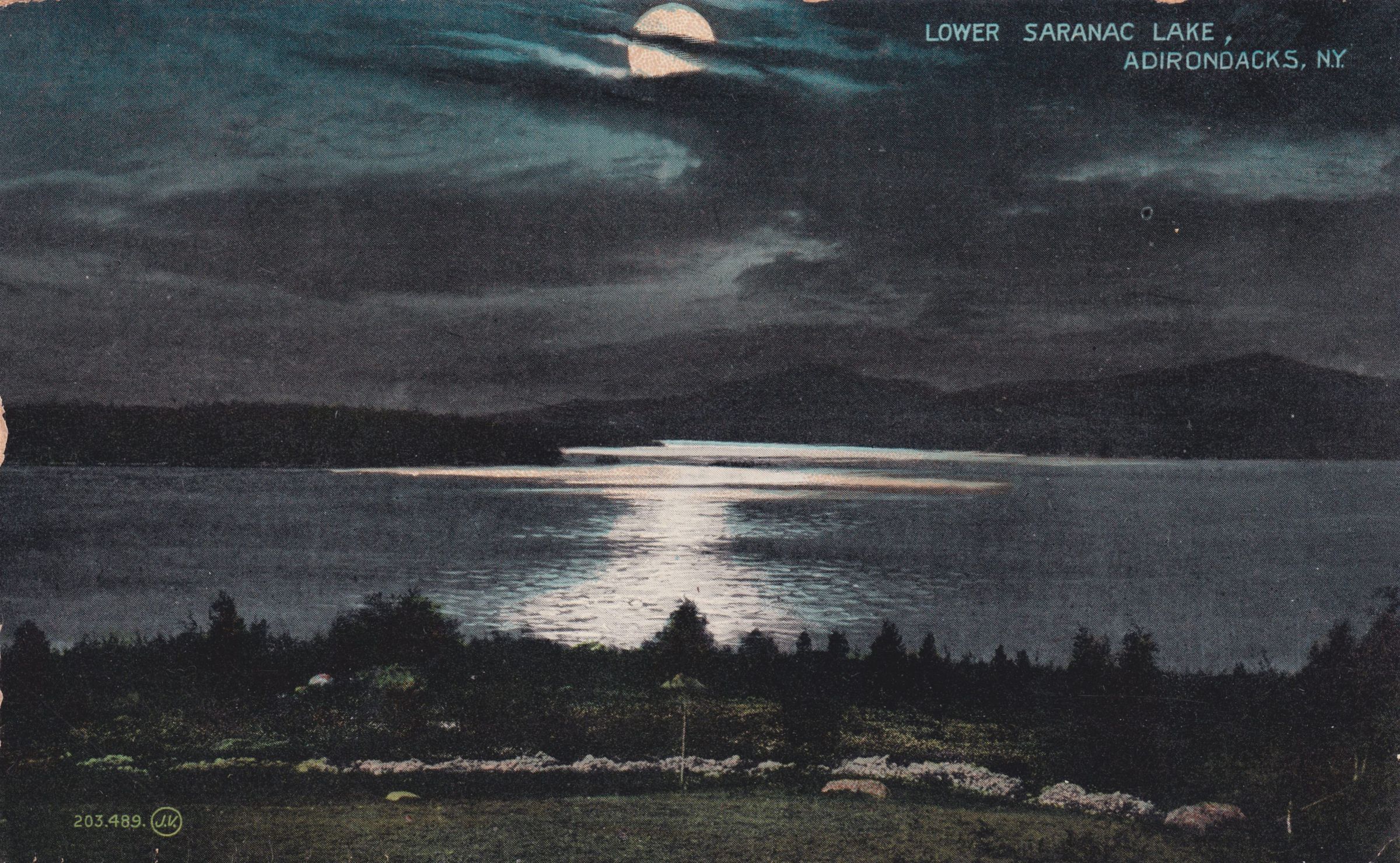 Color postcard looking out over Lower Saranac Lake, with the moon shining behind clouds at the top of the image. The printed caption on the front of the card reads, "Lower Saranac Lake, Adirondacks, N.Y." Used, divided back, postmarked April 2, 1913, Saranac Lake, NY. Printed by the Valentine & Sons' Publishing Co., Ltd., New York. Handwritten message on back reads, "Dearest Ruthie, Am to be examined by Dr. Baldwin in the morning to find out just how I am and also to know about coming home. Will probably write tomorrow night and let you know the particulars. We have had a regular blizzard today. This is a picture of the lake I had the sleigh ride on. Lots of love to you both, from Emily. Apr. 1, 1913." Mailed to Mrs. Theodore W. Dearborn, 2053 Commonwealth Av., Auburndale, Mass.Subject Place