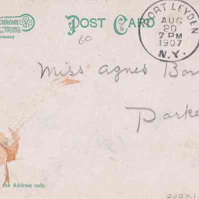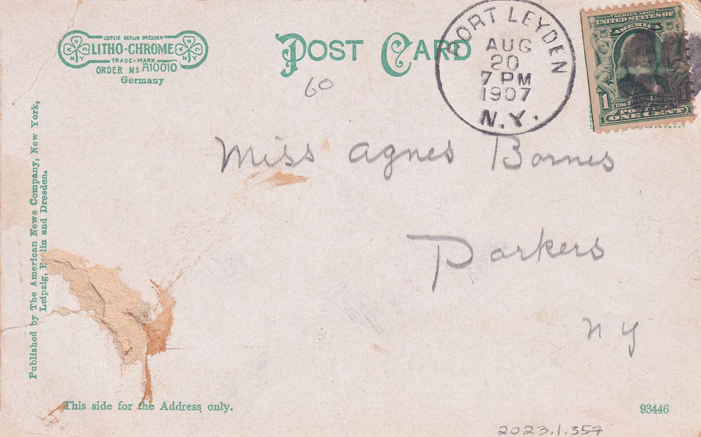 Handwritten message on front reads, "Hello Agnes, How is this for a porch. RLM." Mailed to Miss Agnes Barnes, Parkers, NY.Subject Place