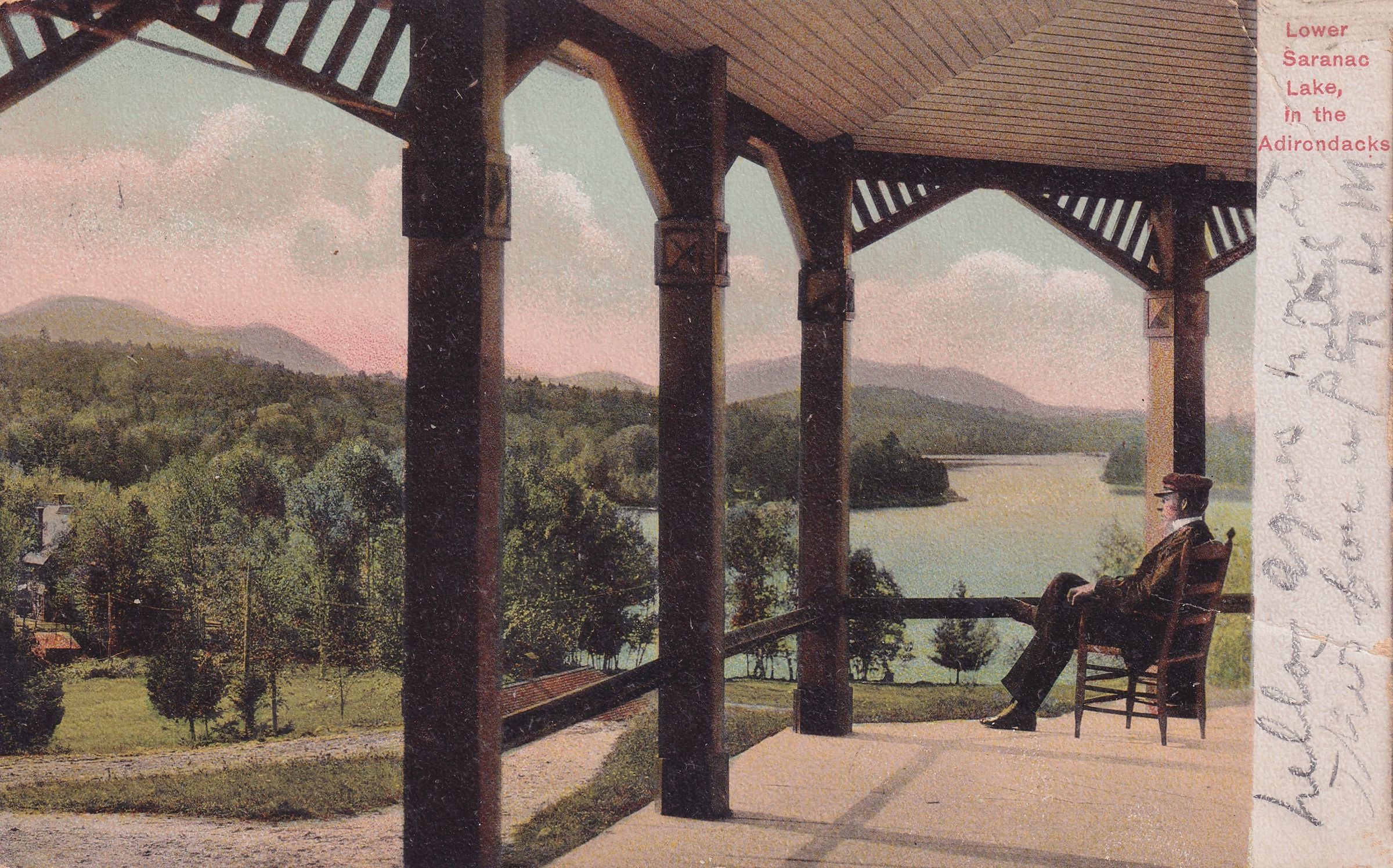 Color postcard showing the view from the porch of the Hotel Algonquin toward Lower Saranac Lake. There is a man seated in a chair on the porch, looking out at the view. Printed caption on front reads, "Lower Saranac Lake, in the Adirondacks." Printed by the American News Company, New York. Used, undivided back, white box at front right side for message, postmarked Port Leyden, NY, August 20, 1907.