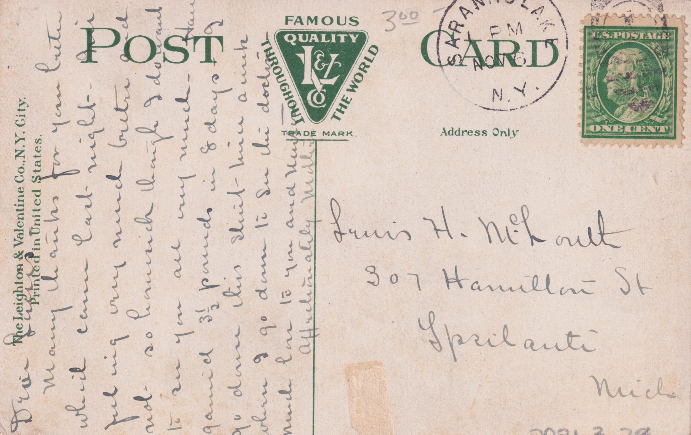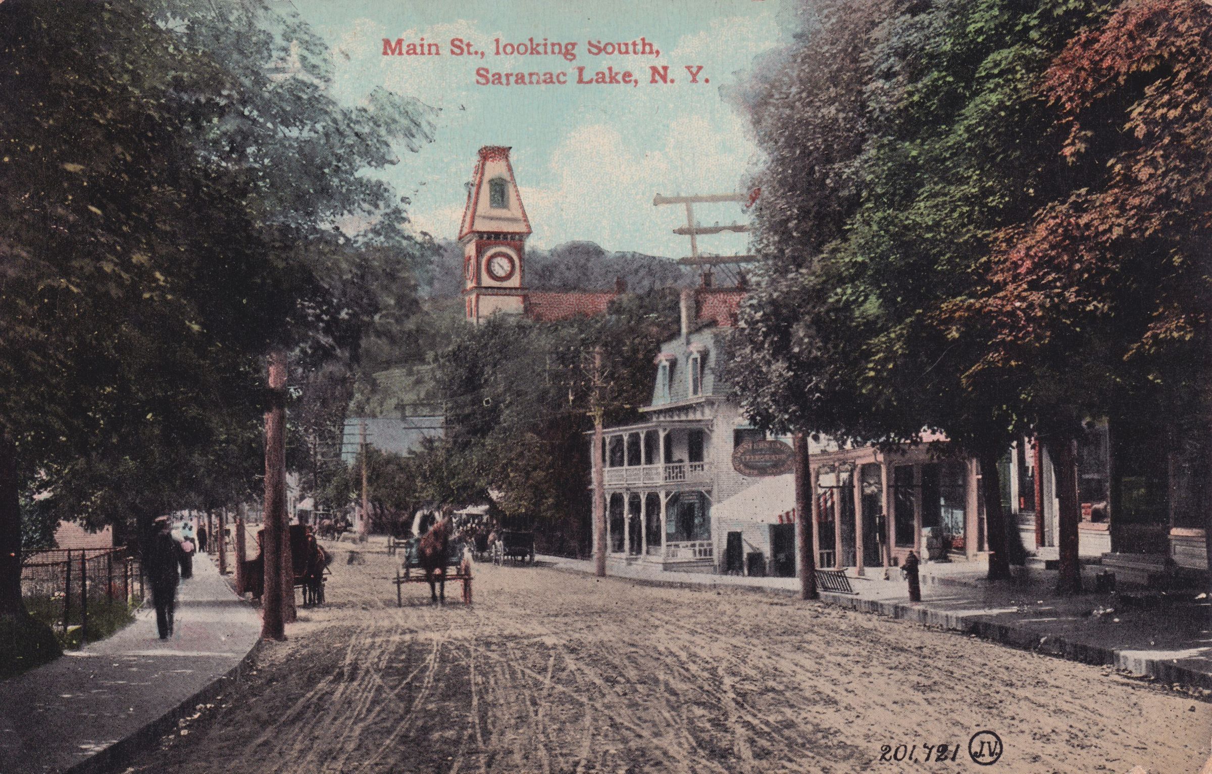 Color postcard showing Main Street looking south toward the old Harrietstown Town Hall and Milo Miller's Store. The street is full of horse-drawn vehicles. Used, divided back, postmarked November 6, 1912, Saranac Lake, NY. Printed by the Leighton & Valentine Co. NY City. Printed caption on the front reads, "Main St., Looking South, Saranac Lake, N.Y." Handwritten message on the back reads, "Dear Lewis - Many thanks for your letter which came last night. Am feeling very much better and not so homesick thought I do want to see you all very much. Have gained 3 1/2 pounds in 8 days. I go down this street twice a week when I go down to see the doctor. Much love to you and [?]. Affectionately, Mother." Mailed to Lewis H. McLouth, 307 Hamilton St., Ypsilanti, MI.Subject Place