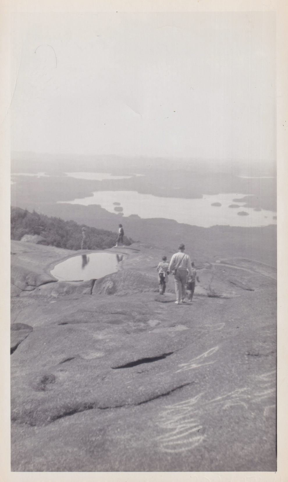 Black-and-White photograph looking northeast from atop Ampersand Mountain toward Middle Saranac Lake. People can be seen walking along the mountaintop. Handwritten caption on reverse reads, "Mt. Ampersand, 1952."Photograph Details