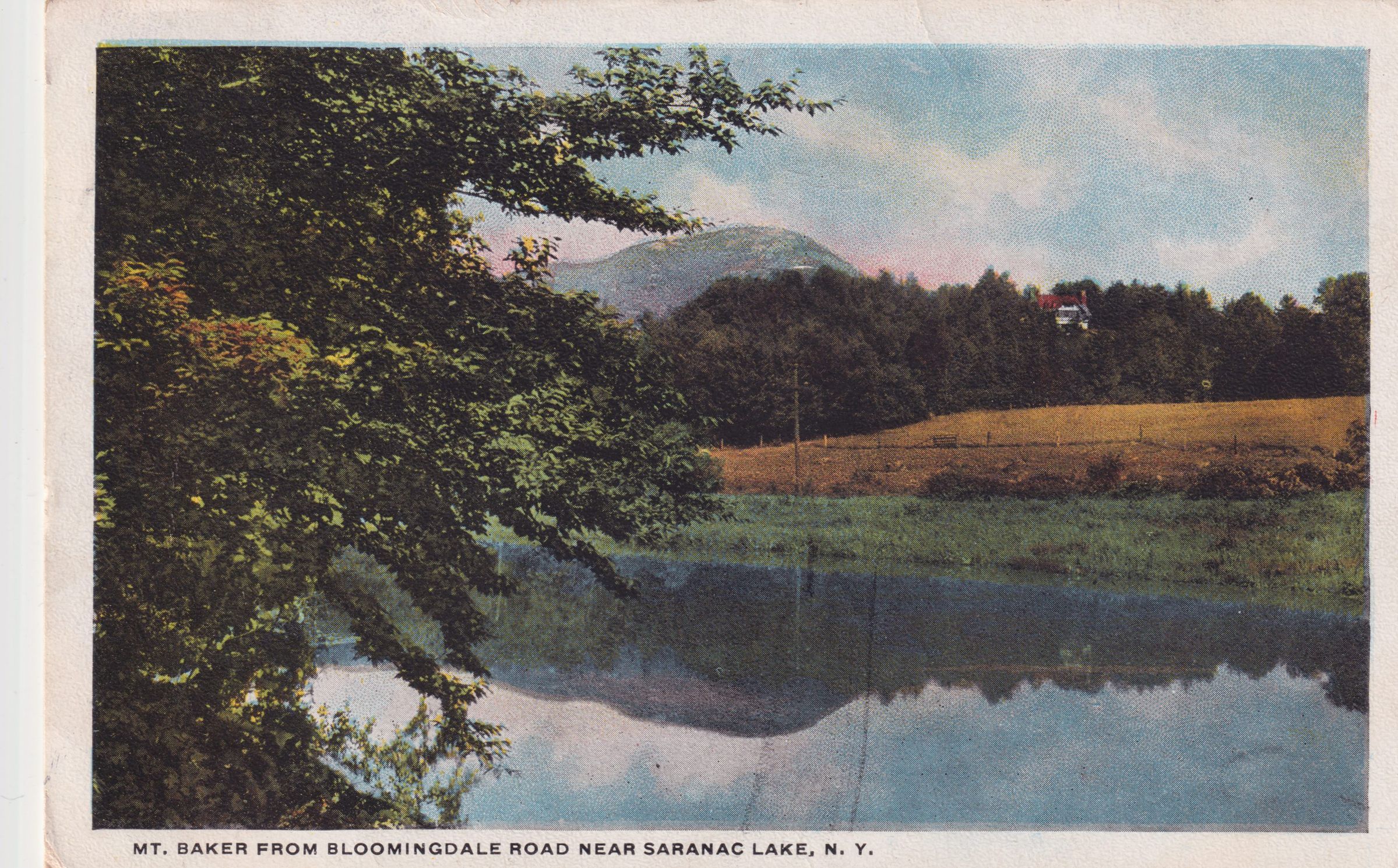 Color postcard of Mt. Baker across the Saranac River from the Bloomingdale Road. An unidentified house is visible among the trees. Used, divided back, white border, postmarked July [?], 1922. Printed by Santway Photo - Craft Company, Inc. Watertown, NY. Caption printed on front reads, "Mt. Baker from Bloomingdale Road near Saranac Lake, N.Y." Handwritten message on back reads, "They made me stay in bed yesterday, temp 100, don't think the Dr. thot [sic] I ought get up today but he finally let me. My trunk hasn't come yet. Will have lots to write when I get it. Don't have very much attention. Dr. comes in the morn and looks at you. Nurses takes temp 3 times a day. Eats are all right. People on the porch are nice. [Illegible], Friday. Am opposite the road from the Main Bldg where it says one may [illegible] & [illegible] the mts. little too much [illegible] from my chair. My [illegible] have gone [illegible] goods of [illegible]." Mailed to Dr. R. S. Pettibone, Willard, New York.Subject Place
