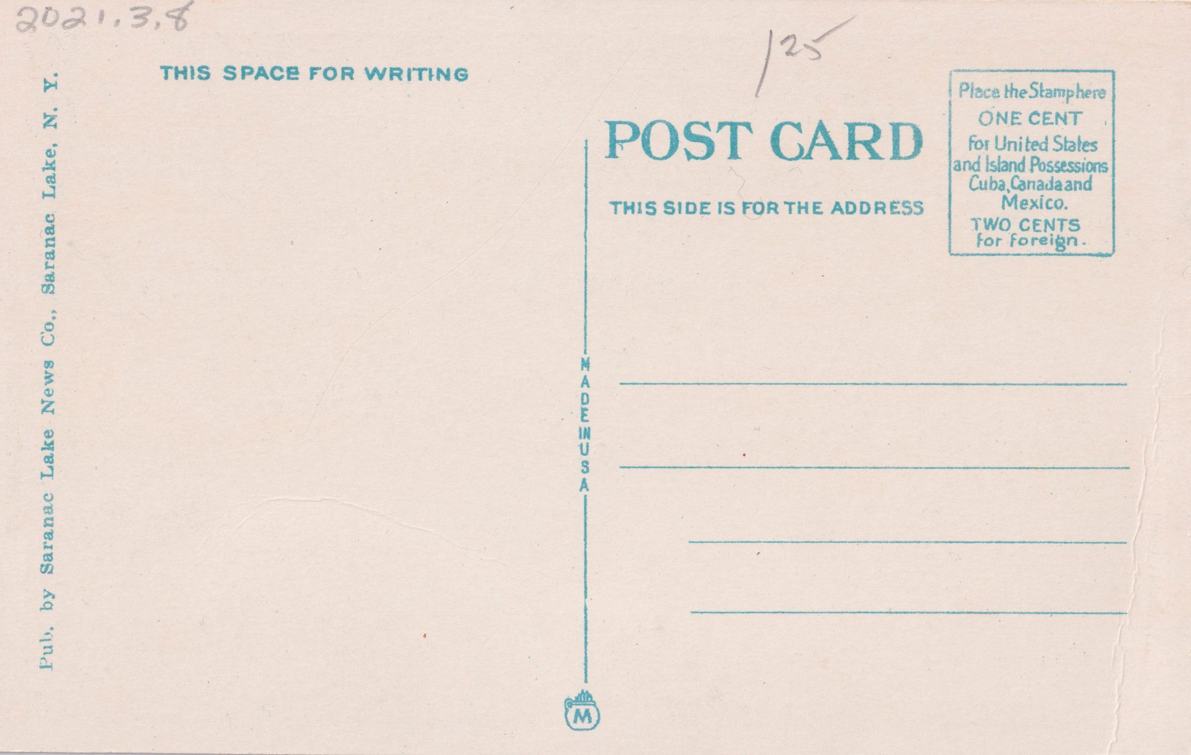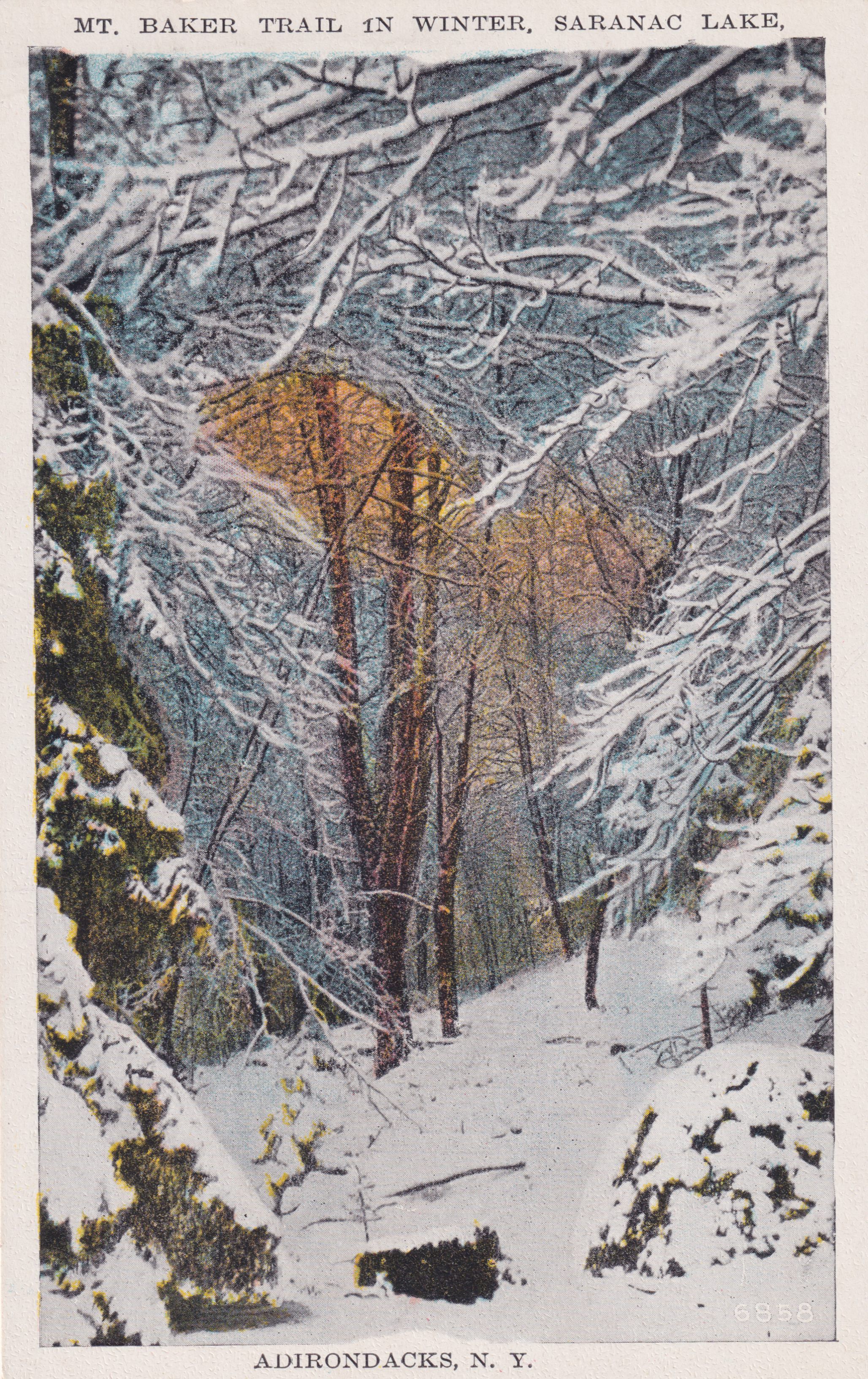 Color postcard of the trail up Mt. Baker in wintertime. Unused, divided back. Published by Saranac Lake News Co., Saranac Lake, N.Y. Caption printed on front reads, "Mt. Baker Trail in Winter, Saranac Lake. Adirondacks, N.Y."Subject Place