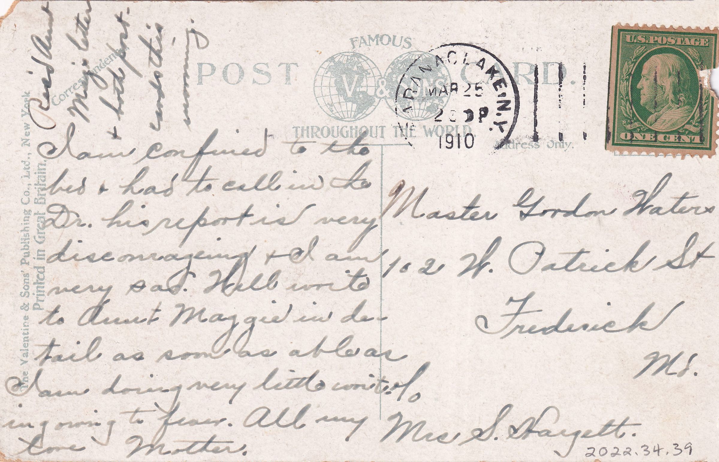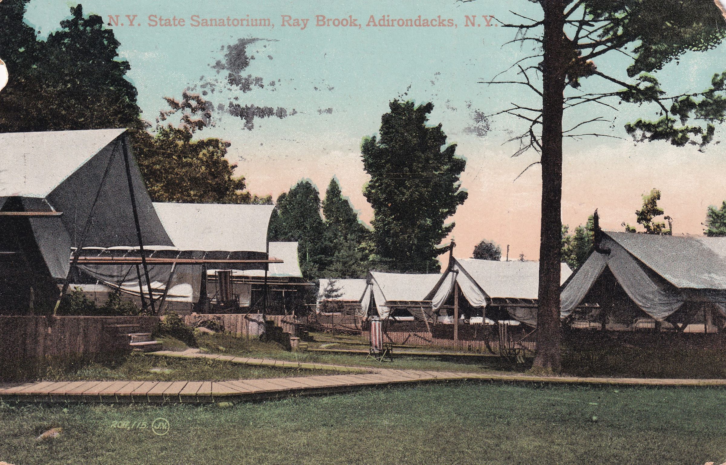 Color postcard showing wood and canvas platform tents linked by a wooden walkway at the New York State Hospital for Incipient Tuberculosis, AKA Ray Brook Sanatorium. Printed caption on front reads, "N. Y. State Sanatorium, Ray Brook, Adirondacks, N. Y." Printed by the Valentine & Sons' Publishing Co., Ltd., New York. Used, divided back, postmarked Saranac Lake, March 25, 1910. Handwritten message on back reads, "Rec'd Aunt May's letter & both postcards this morning. I am confined to the bed & had to call in the Dr. His report is very discouraging & I am very sad. Will write to Aunt Maggie in detail as soon as able as I am doing very little writing owing to fear. All my love Mother." Mailed to Master Gordon Waters, 102 W. Patrick St., Frederick, MS, c/o Miss S. Hayett.Subject Place