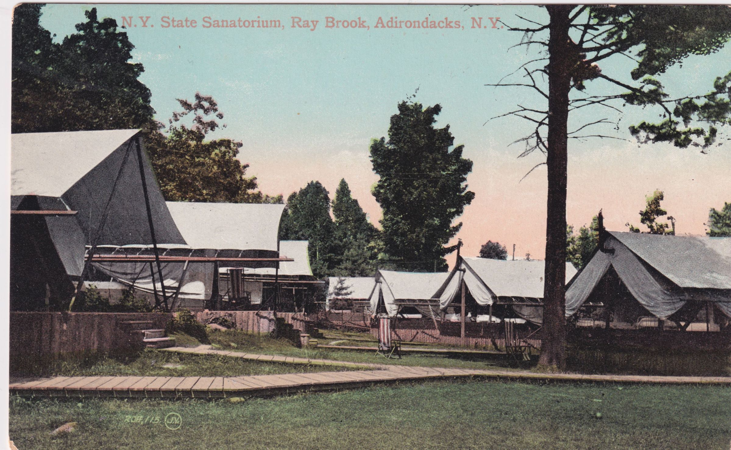 Color postcard showing a group of platform tent sites at New York State Hospital for Incipient Tuberculosis, AKA Ray Brook Sanatorium. The tents are connected by wooden sidewalks. Printed caption on the front reads, "N. Y. State Sanatorium, Ray Brook, Adirondacks, N.Y." Unused, divided back. Printed by the Valentine & Sons' Publishing Co., Ltd., New York.Subject Place