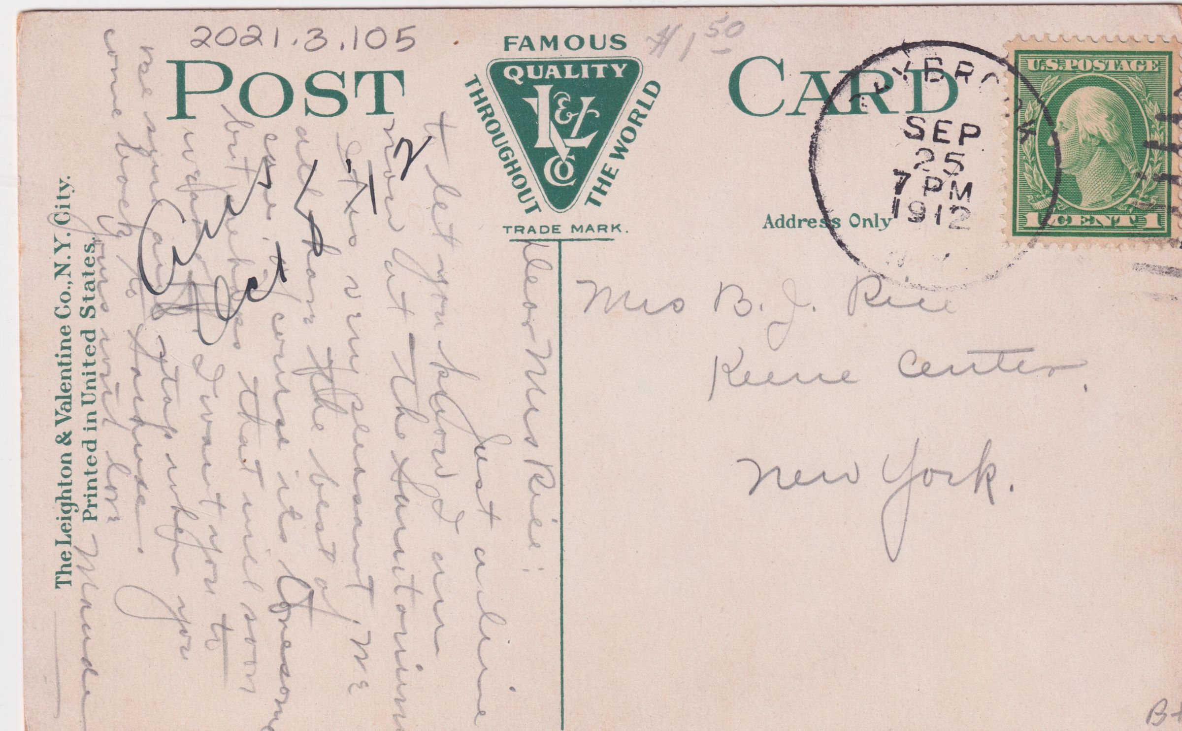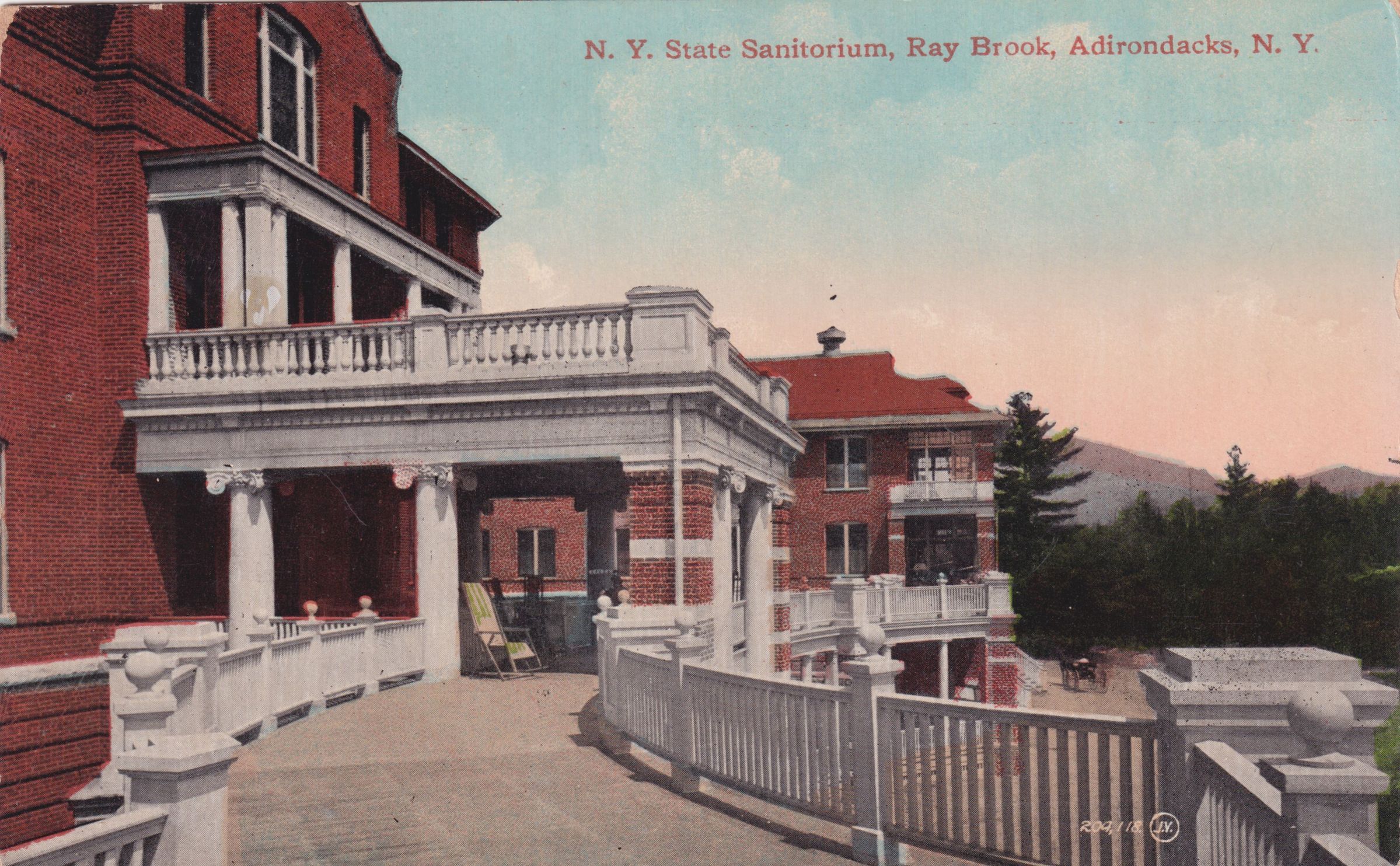Color postcard showing the veranda on the main building of the New York State Hospital for Incipient Tuberculosis, AKA Ray Brook Sanatorium looking toward the East Wing. Printed caption on the front reads, "N. Y. State Sanitorium, Ray Brook, Adirondacks, N. Y." Used, divided back, postmarked Ray Brook, September 25, 1912. Printed by the Leighton & Valentine Co., N.Y. City. Handwritten message on the back reads, "Dear Mrs. Rice, Just a line to let you know I am now at the Sanitorium. It is very pleasant. We all have the best of care. Of course it's lonesome, but [?] hope that will soon wear off. I want you to be sure and stop when you come back to Saranac. Yours with love, Maude." Note in different ink and handwriting reads, "Ans. Oct. 8 '12." Mailed to Mrs. B. J. Rice, Keene Center, New York.Subject Place