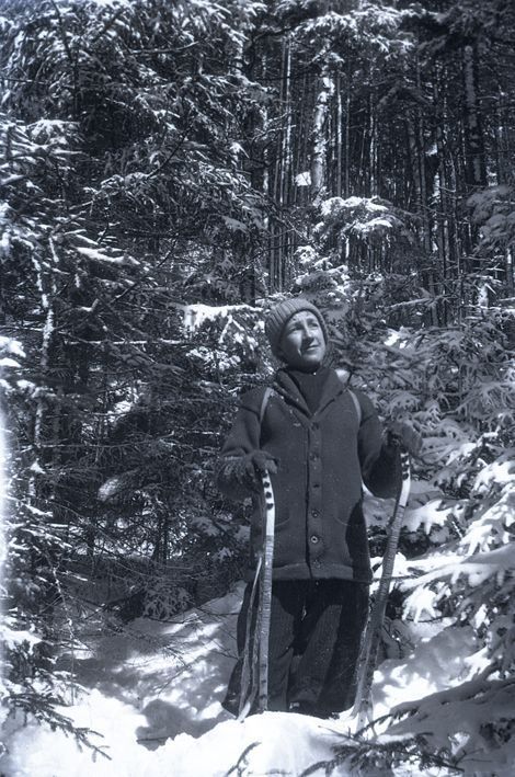 Negative of Mary Ives Baldwin standing in a snow-covered forest, likely on a hike. She's holding two hiking poles.