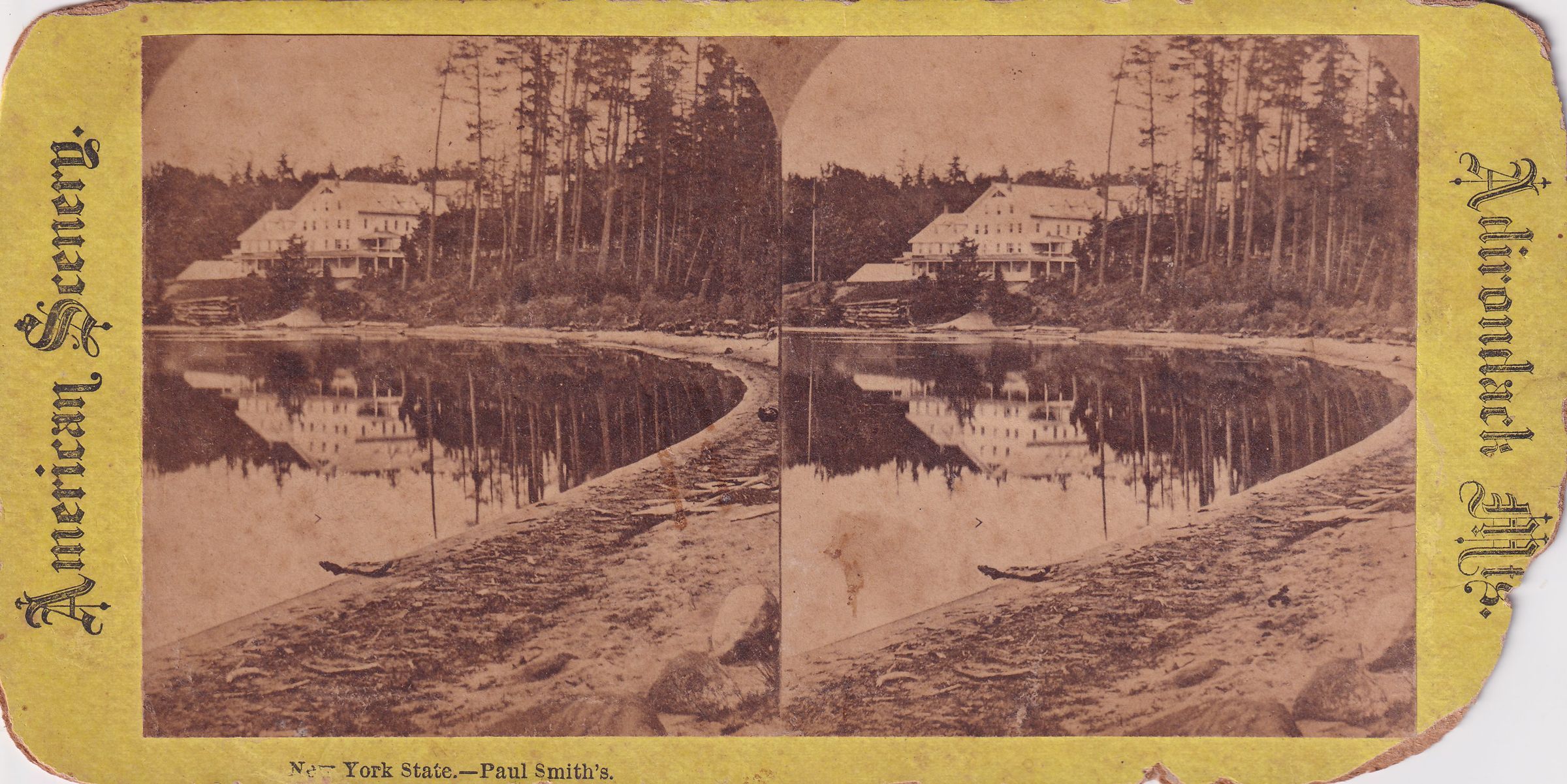Stereoview image of the view along the shore of Lower St. Regis Lake toward Paul Smith's Hotel. Printed caption on front reads, "New York State--Paul Smith's." "American Scenery - Adirondack Mts." printed along sides. Mounted on yellow cardboard backing.Photograph Details
