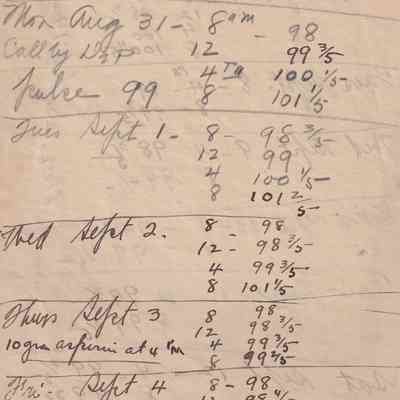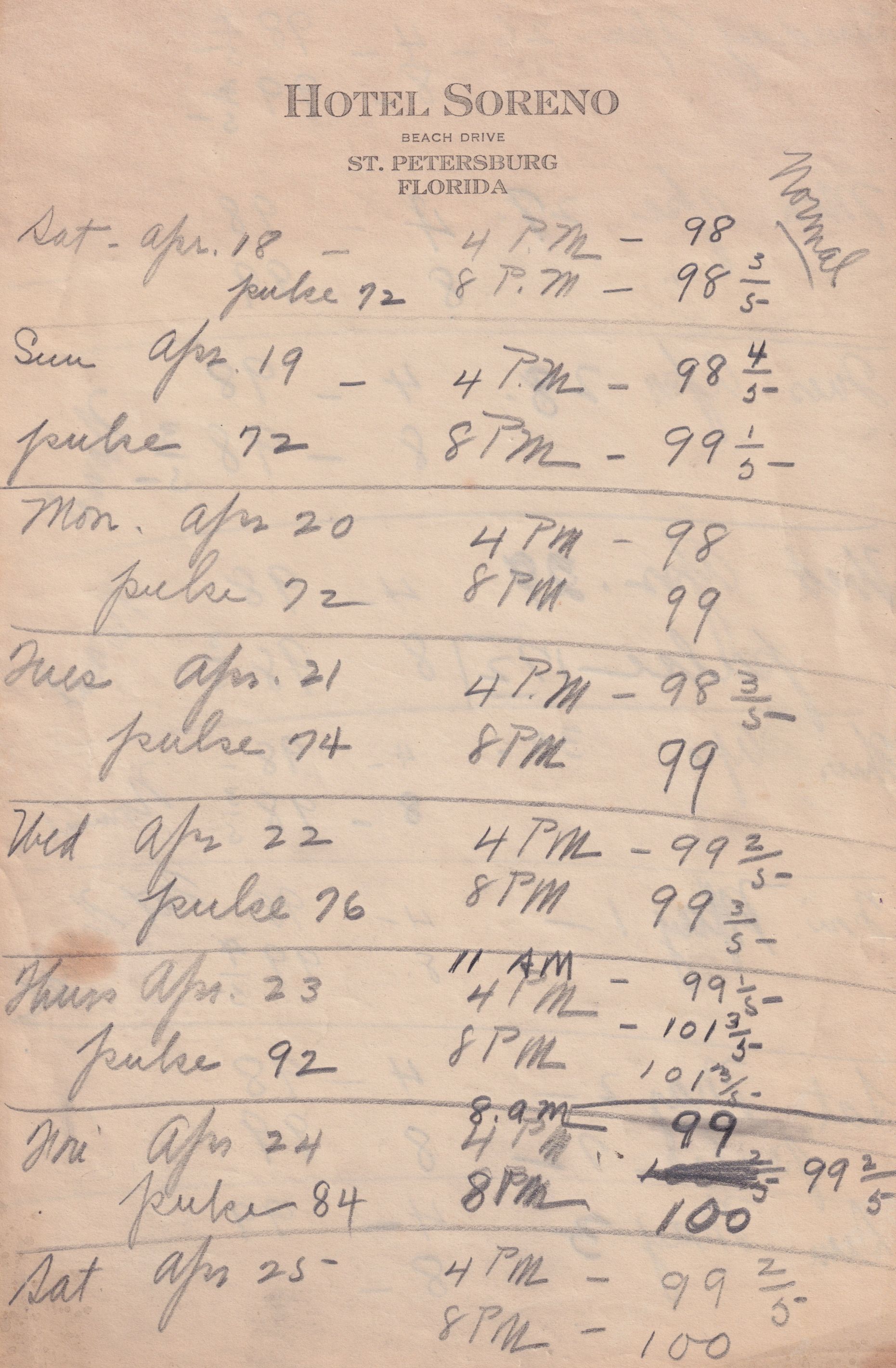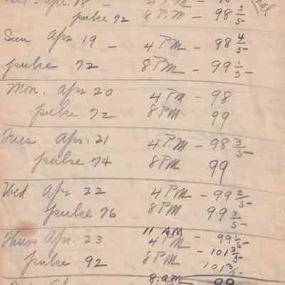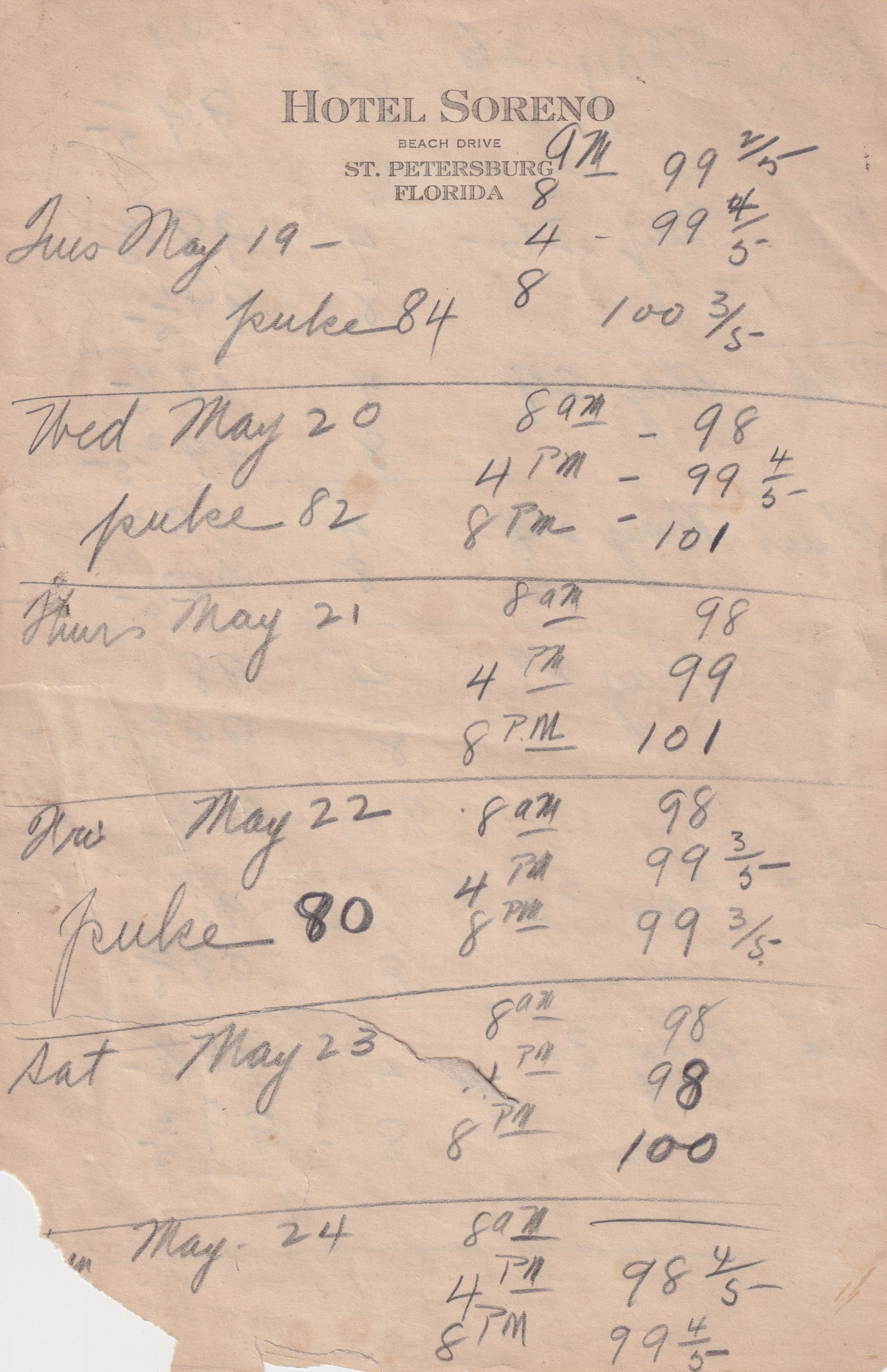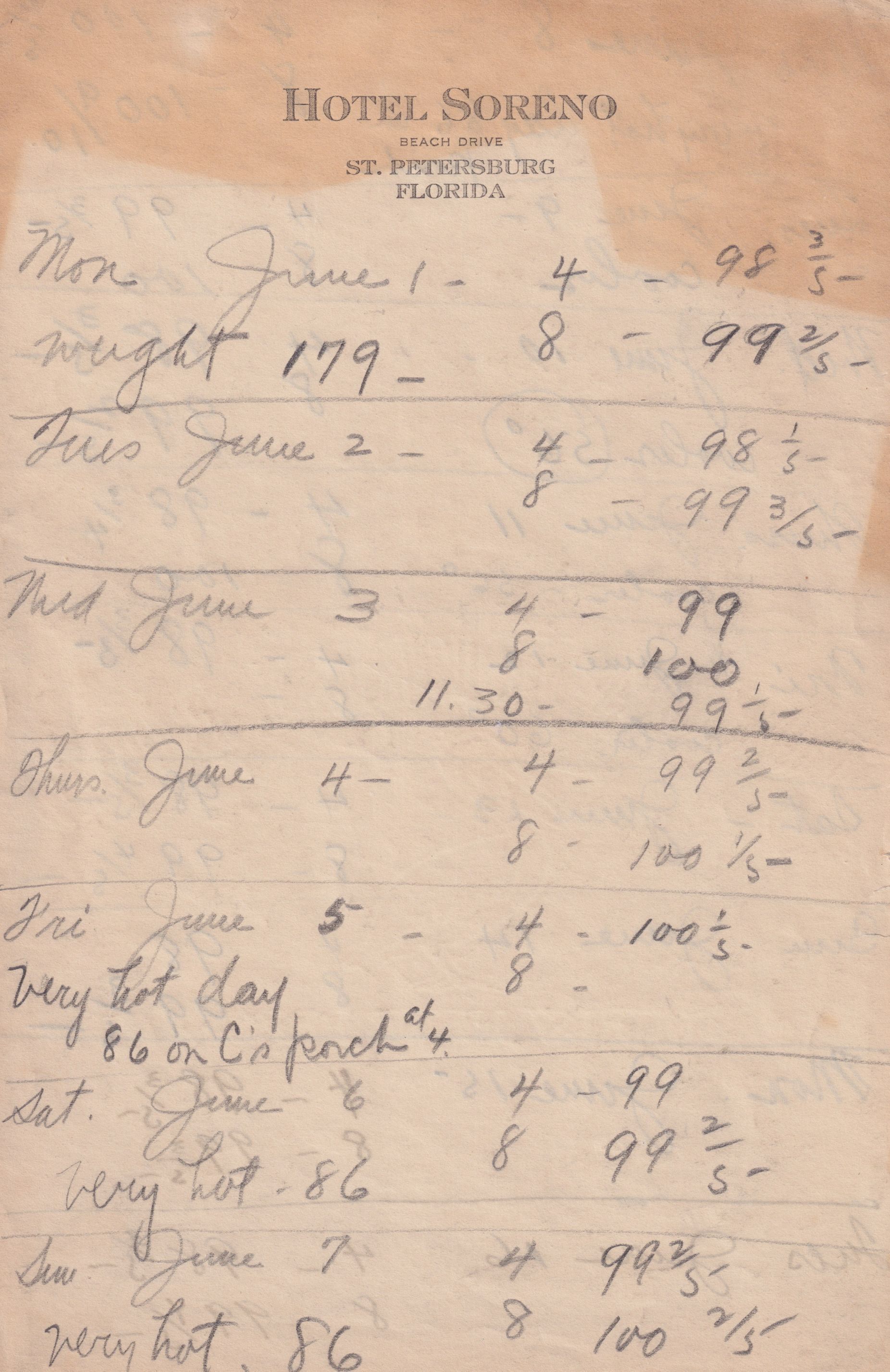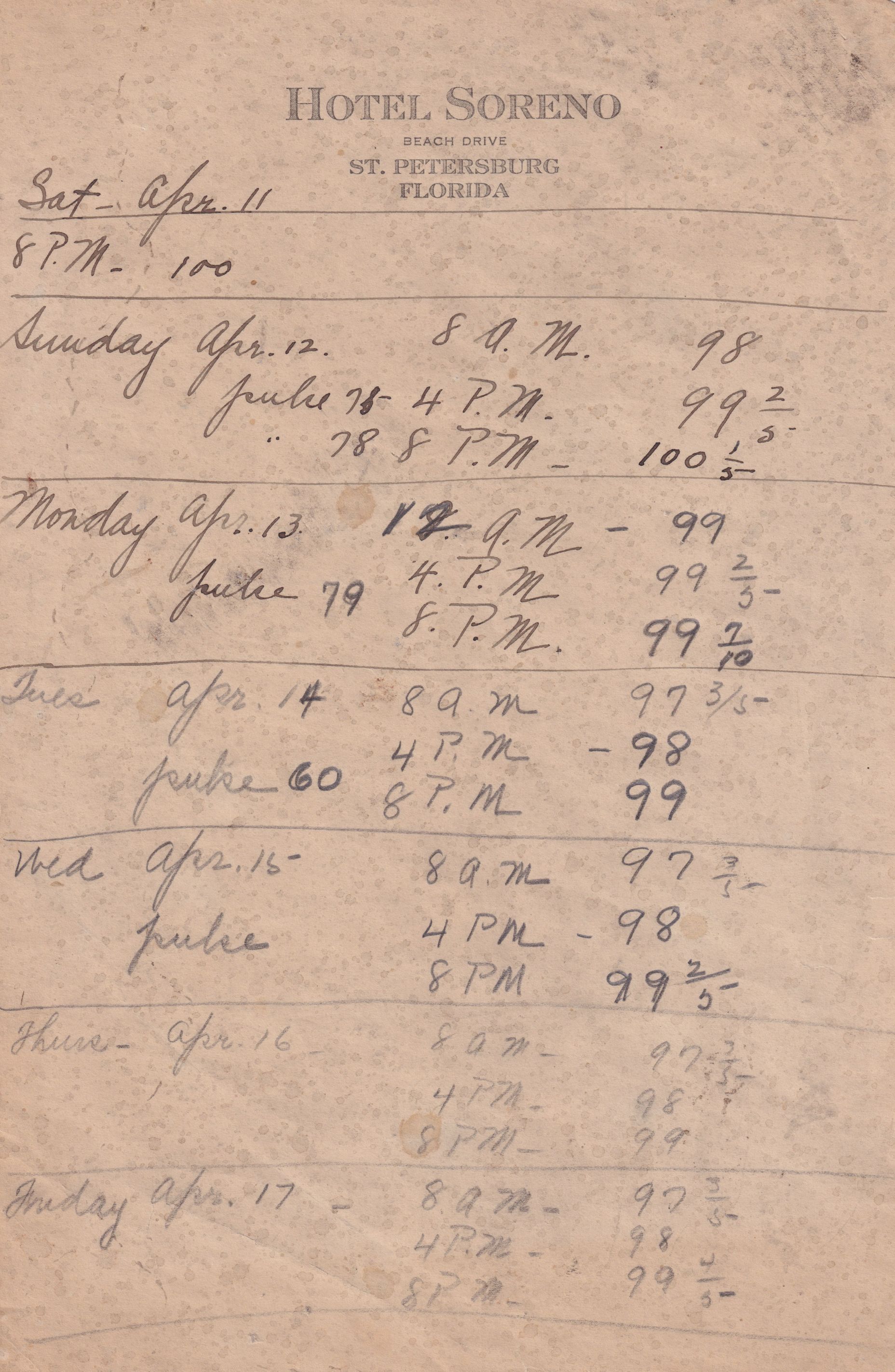 Twenty-three pages of paper with Christy Mathewson's temperature throughout the day recorded on them. Most of the papers are stationery from Hotel Soreno in St. Petersburg, Florida.