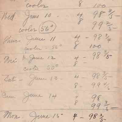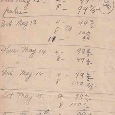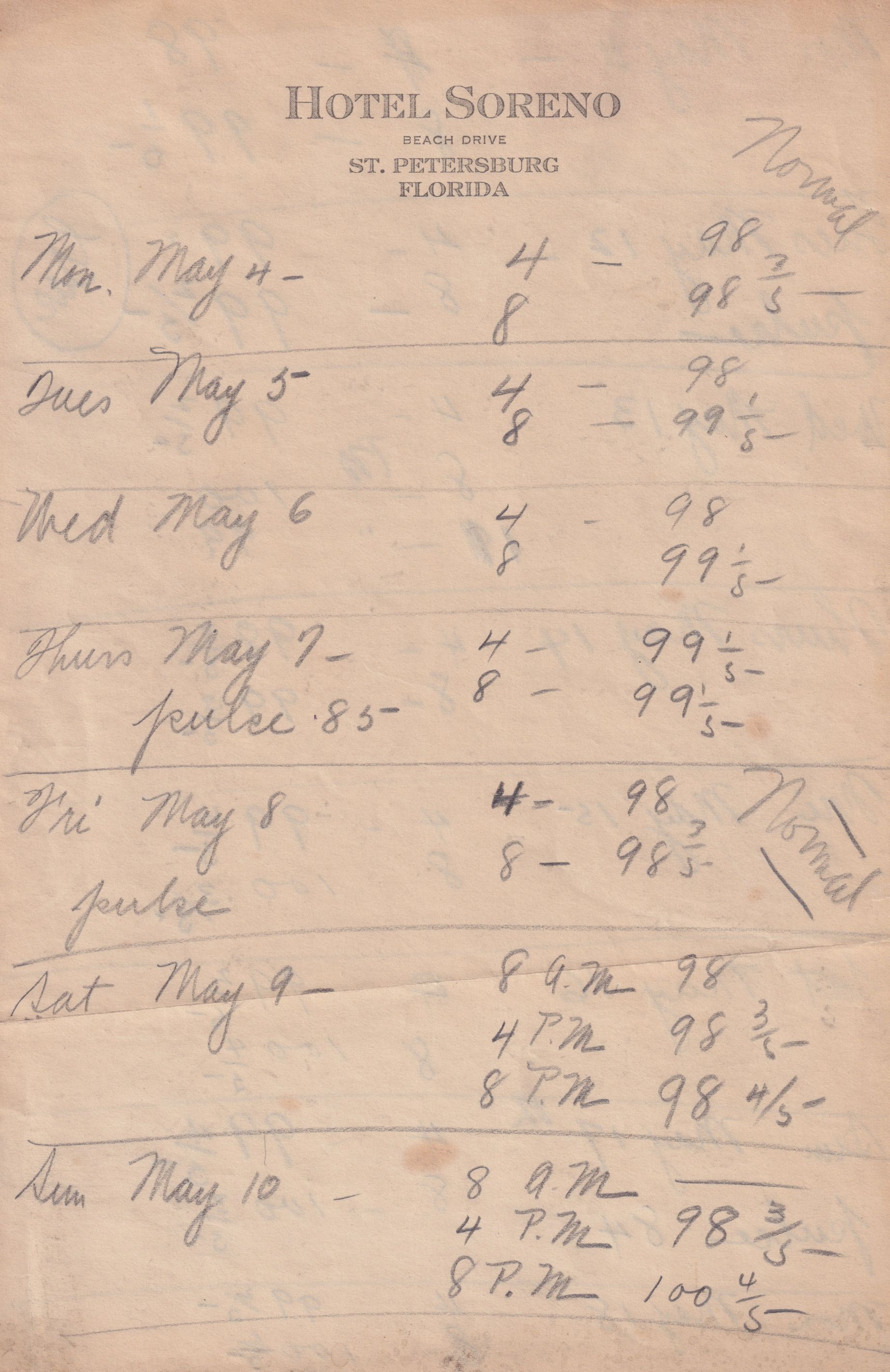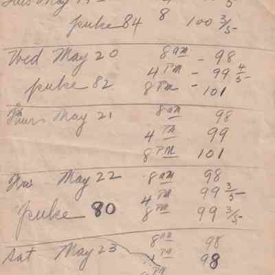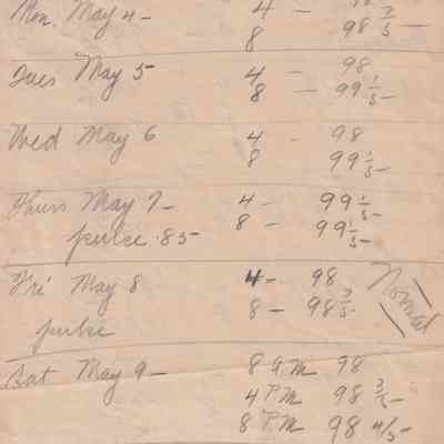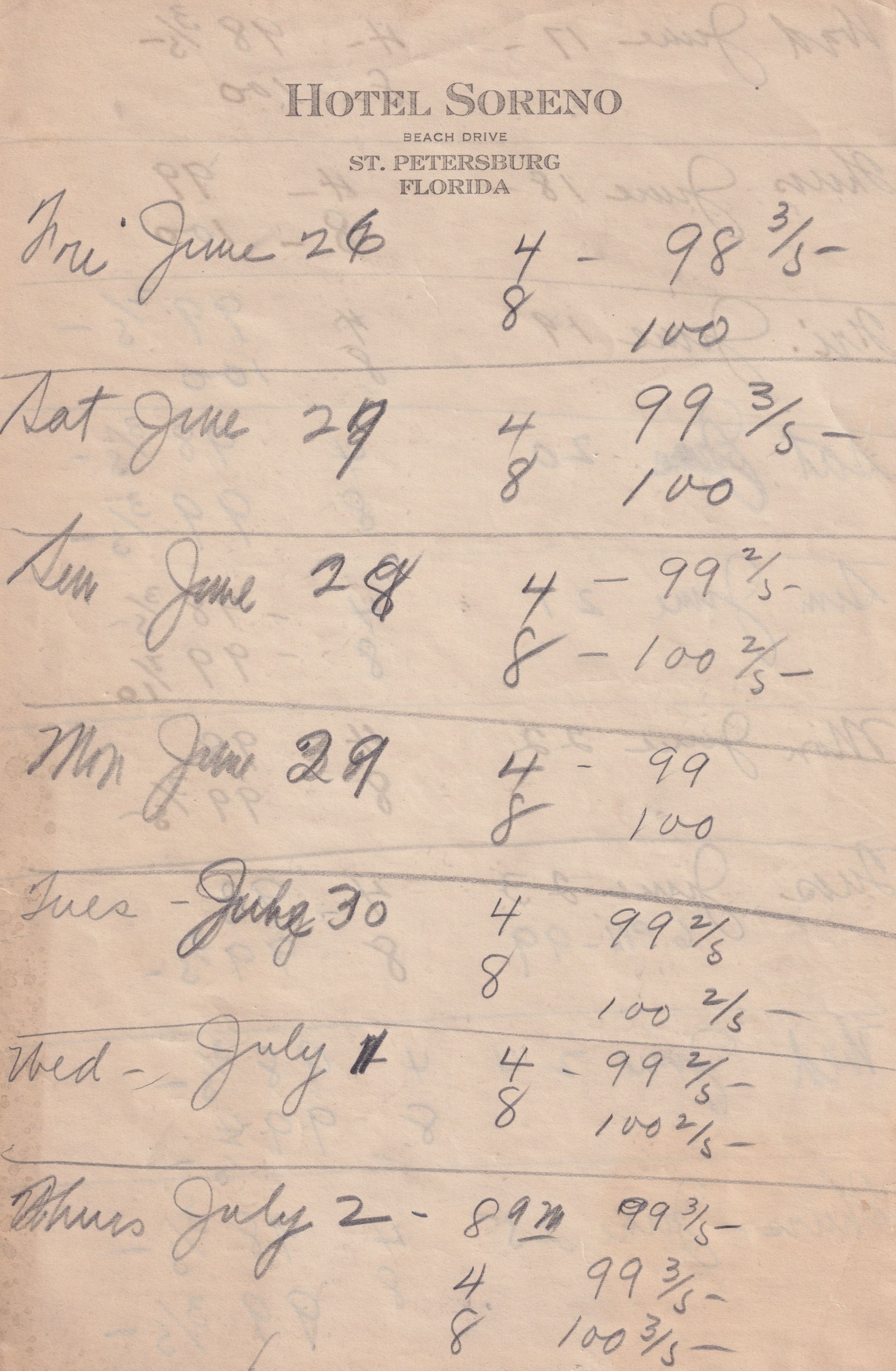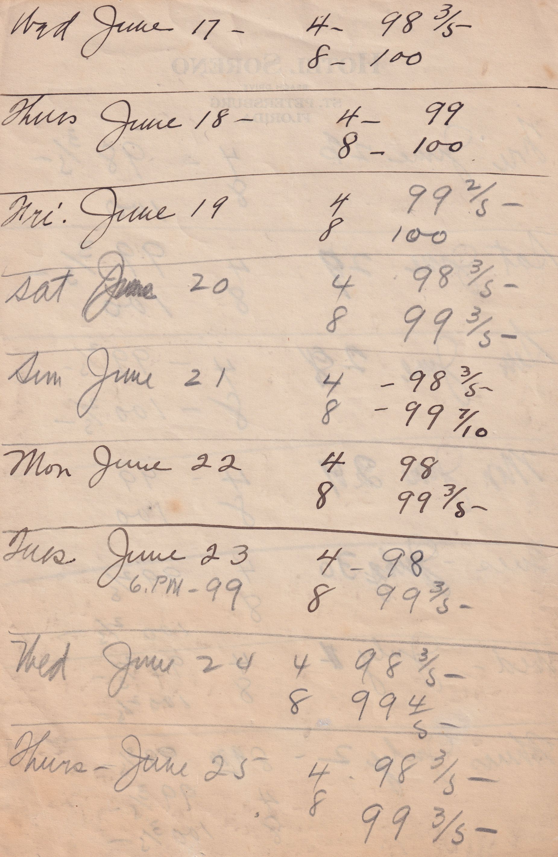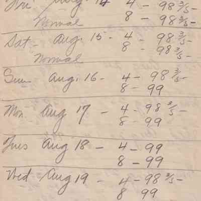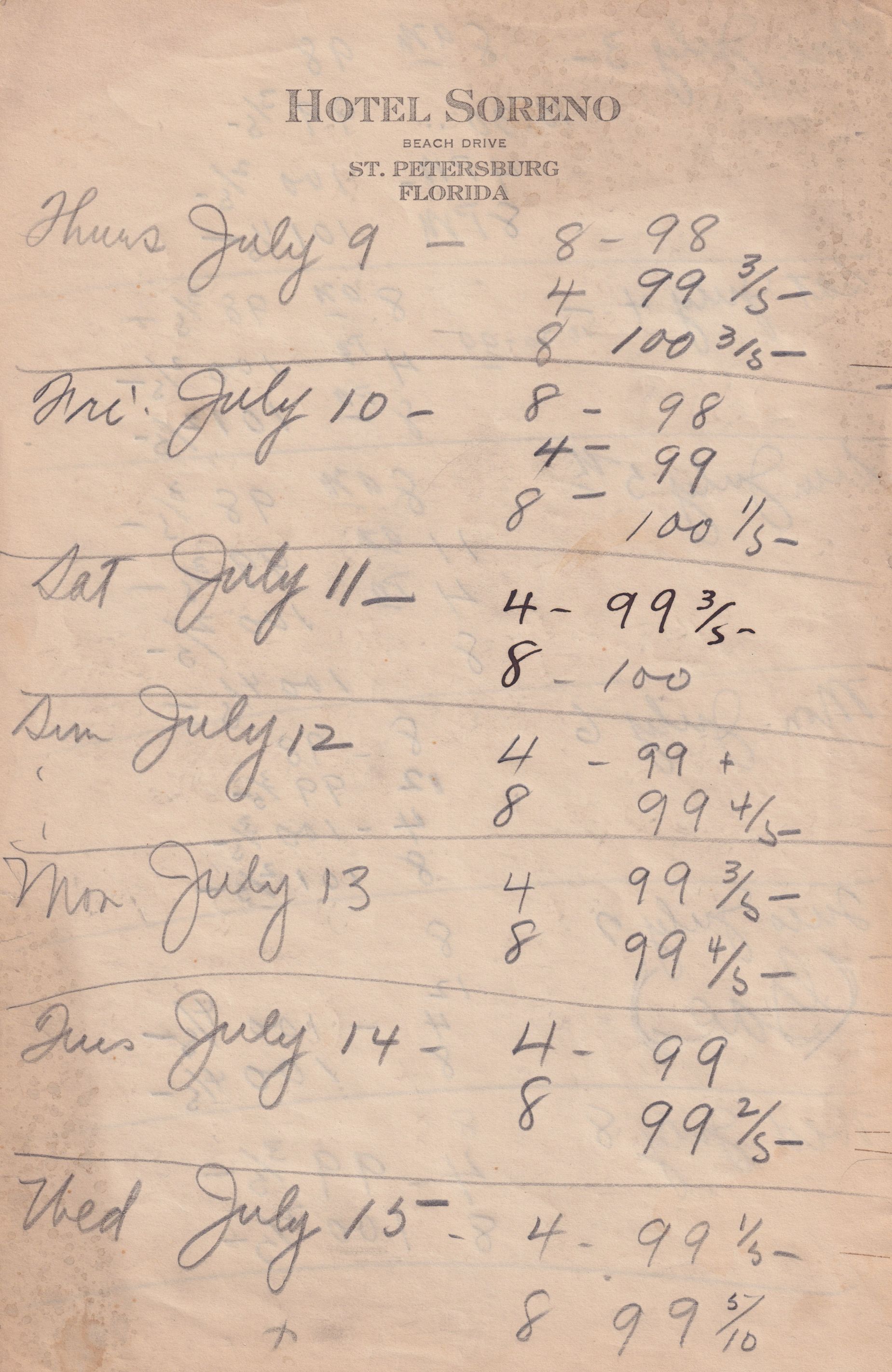 Twenty-three pages of paper with Christy Mathewson's temperature throughout the day recorded on them. Most of the papers are stationery from Hotel Soreno in St. Petersburg, Florida.