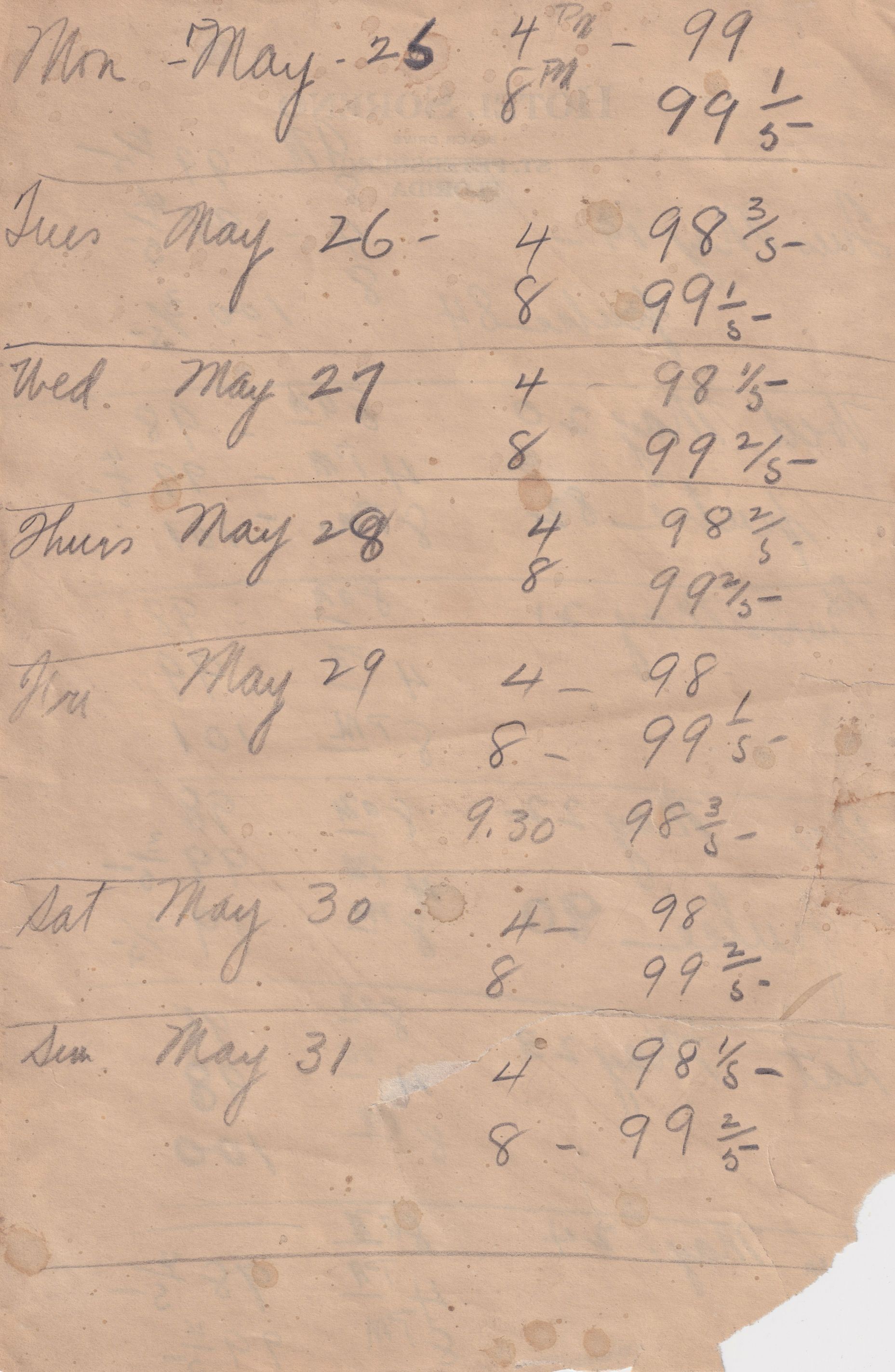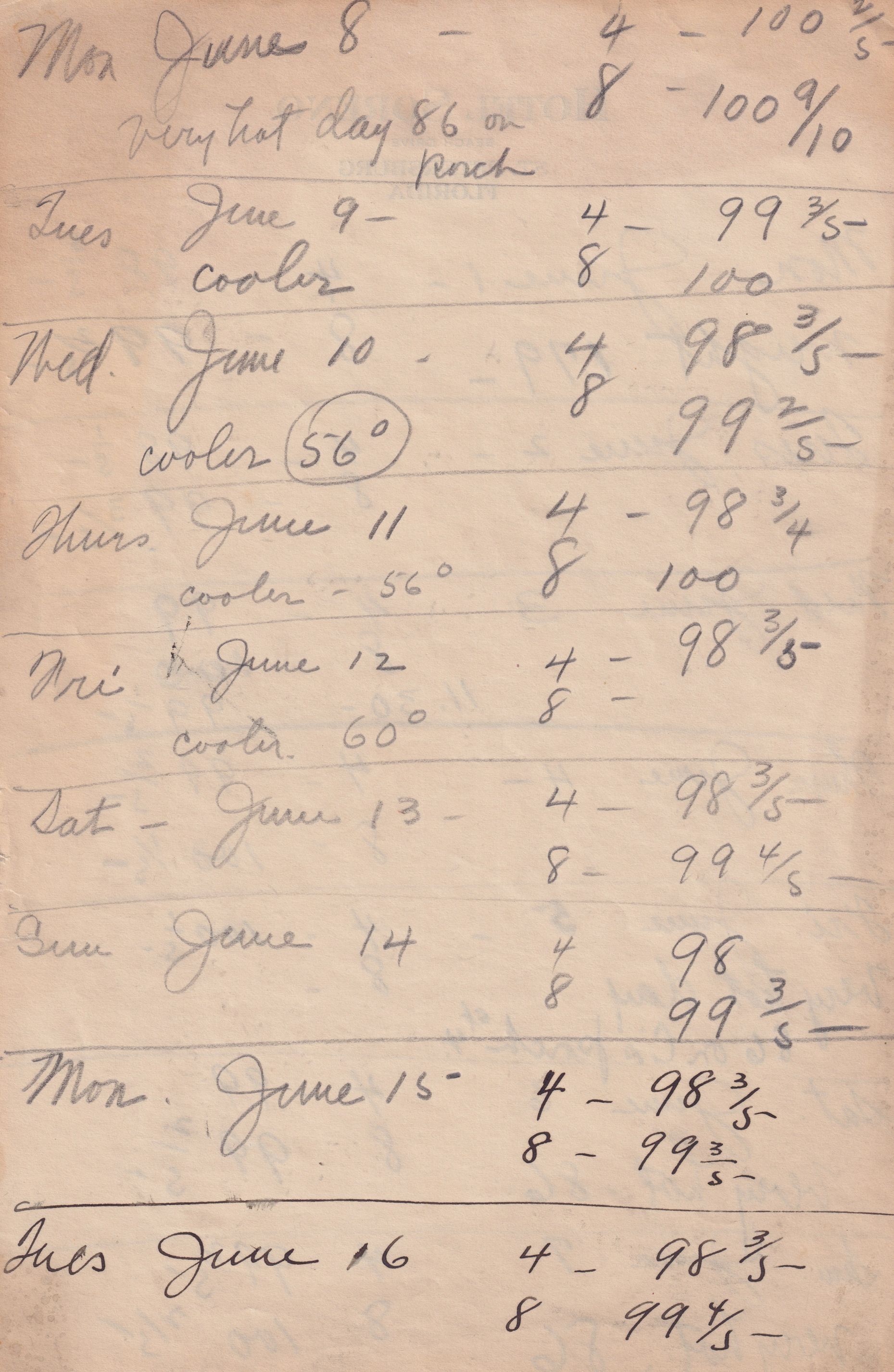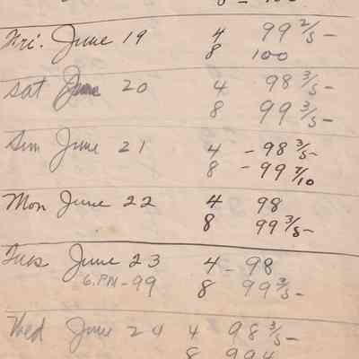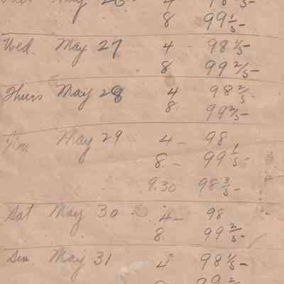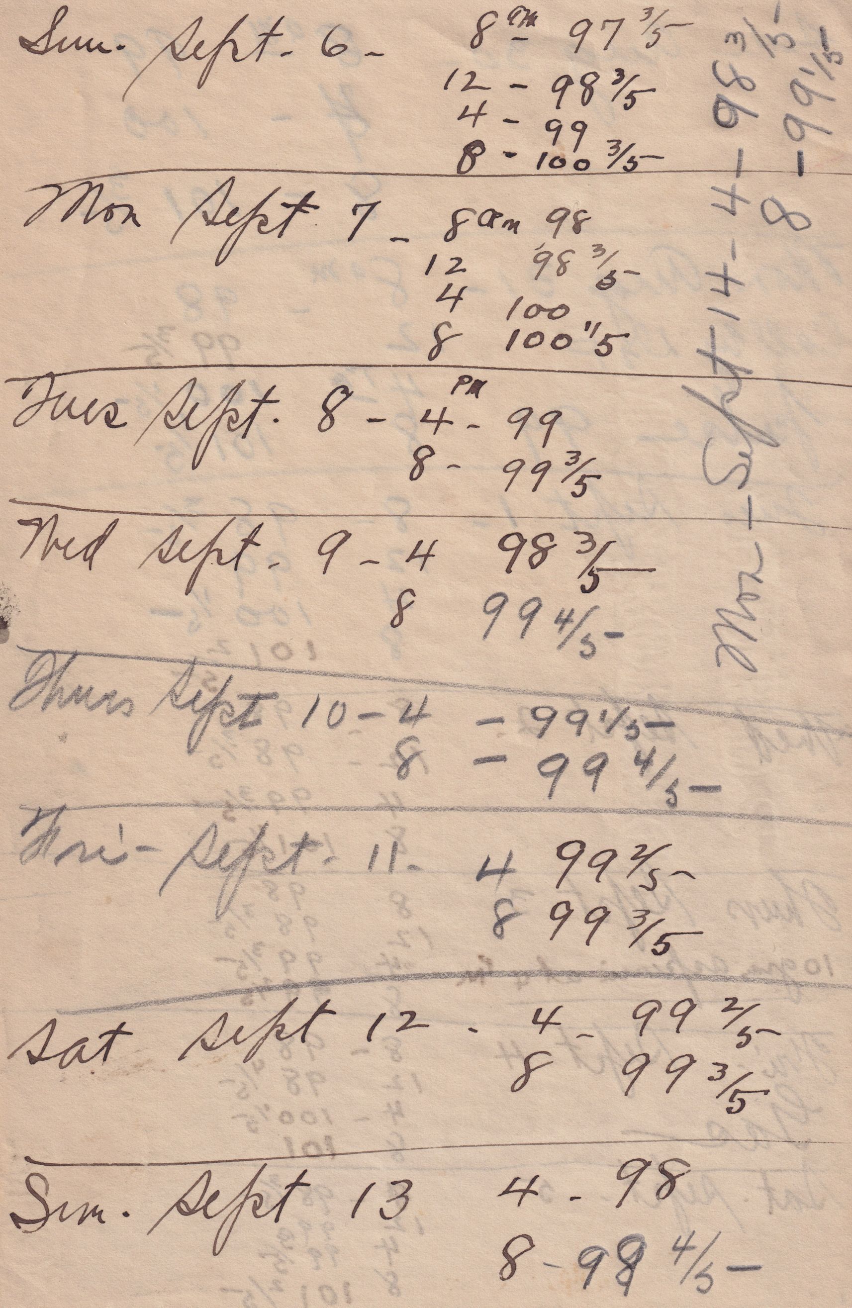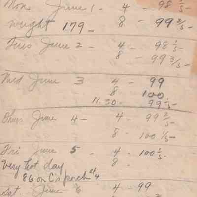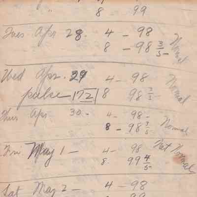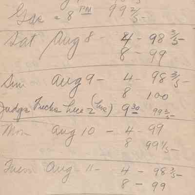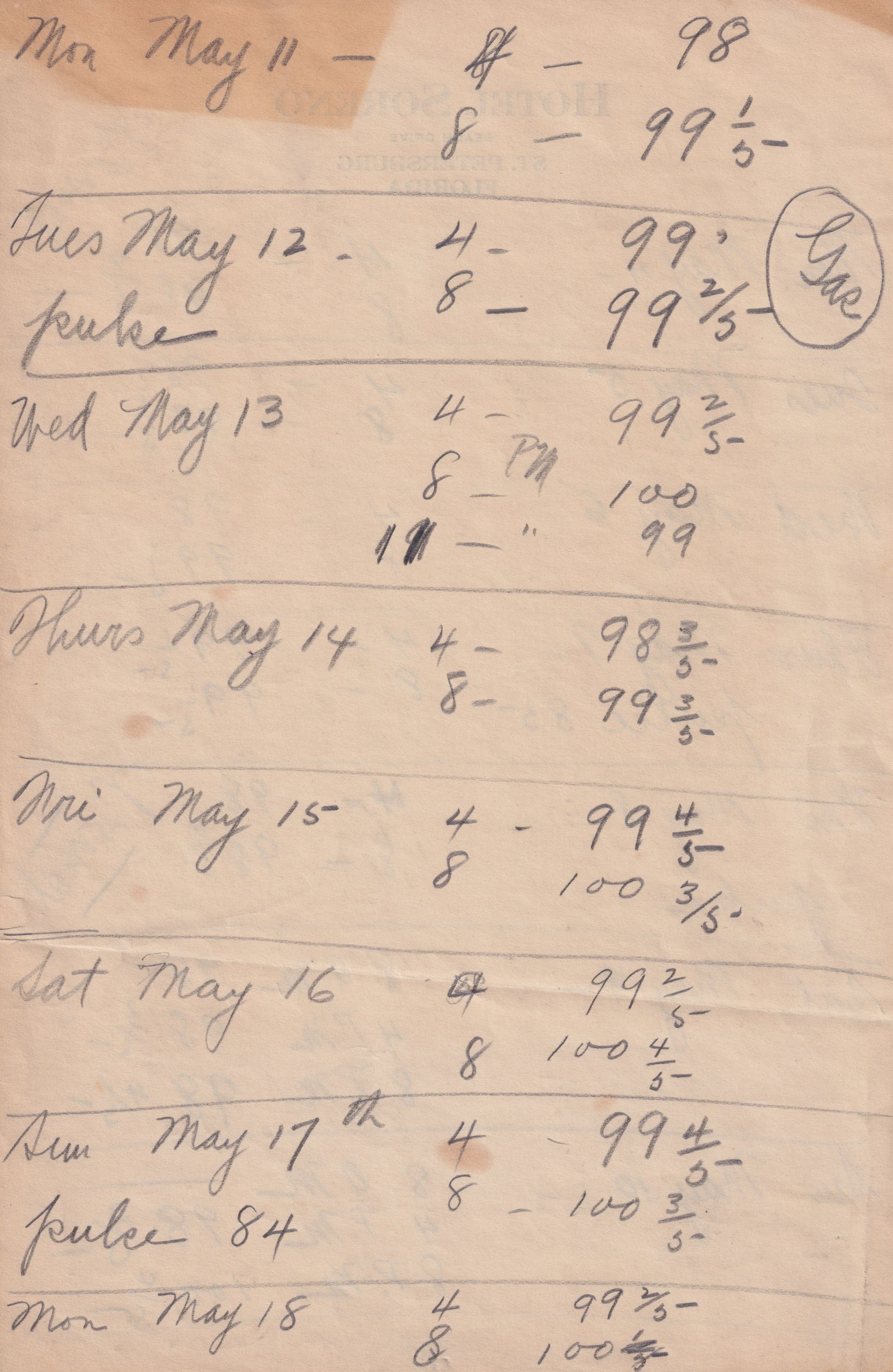 Twenty-three pages of paper with Christy Mathewson's temperature throughout the day recorded on them. Most of the papers are stationery from Hotel Soreno in St. Petersburg, Florida.