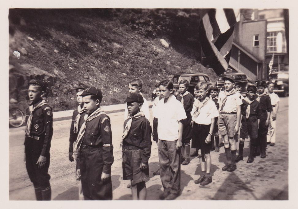 Black-and-White photograph of a group of Boy Scouts lining up for a parade on Broadway. A portion of 117 Broadway is visible behind them. The photograph was likely printed by Kollecker's Kodak and Gift Shop.