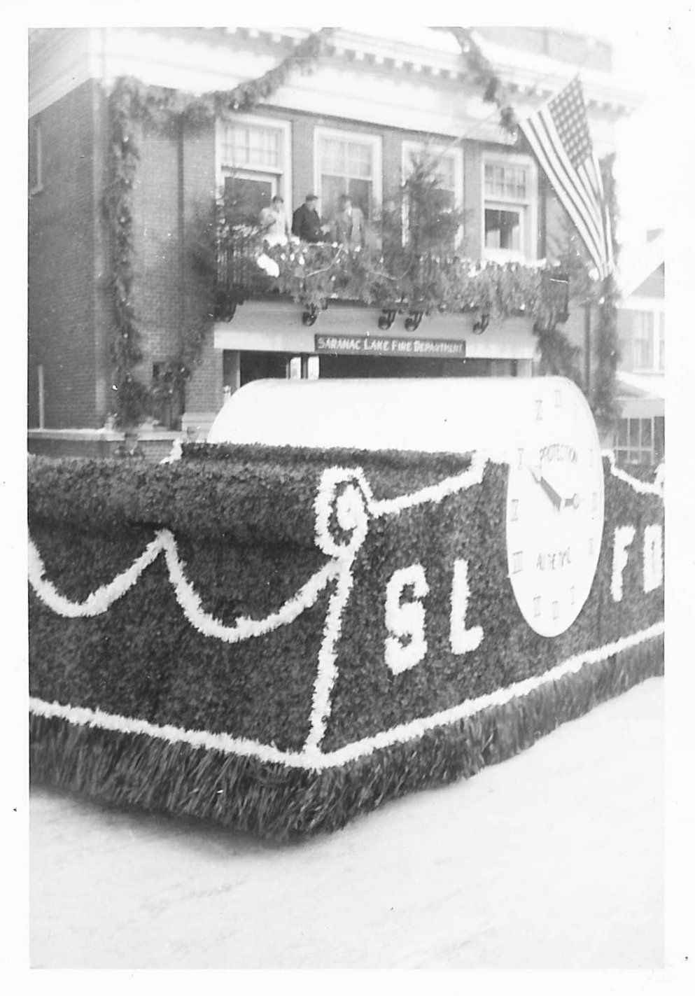 Black-and-White photograph of the Saranac Lake Fire Department 1954 Winter Carnival float in front of the firehouse. The firehouse is decorated for carnival.