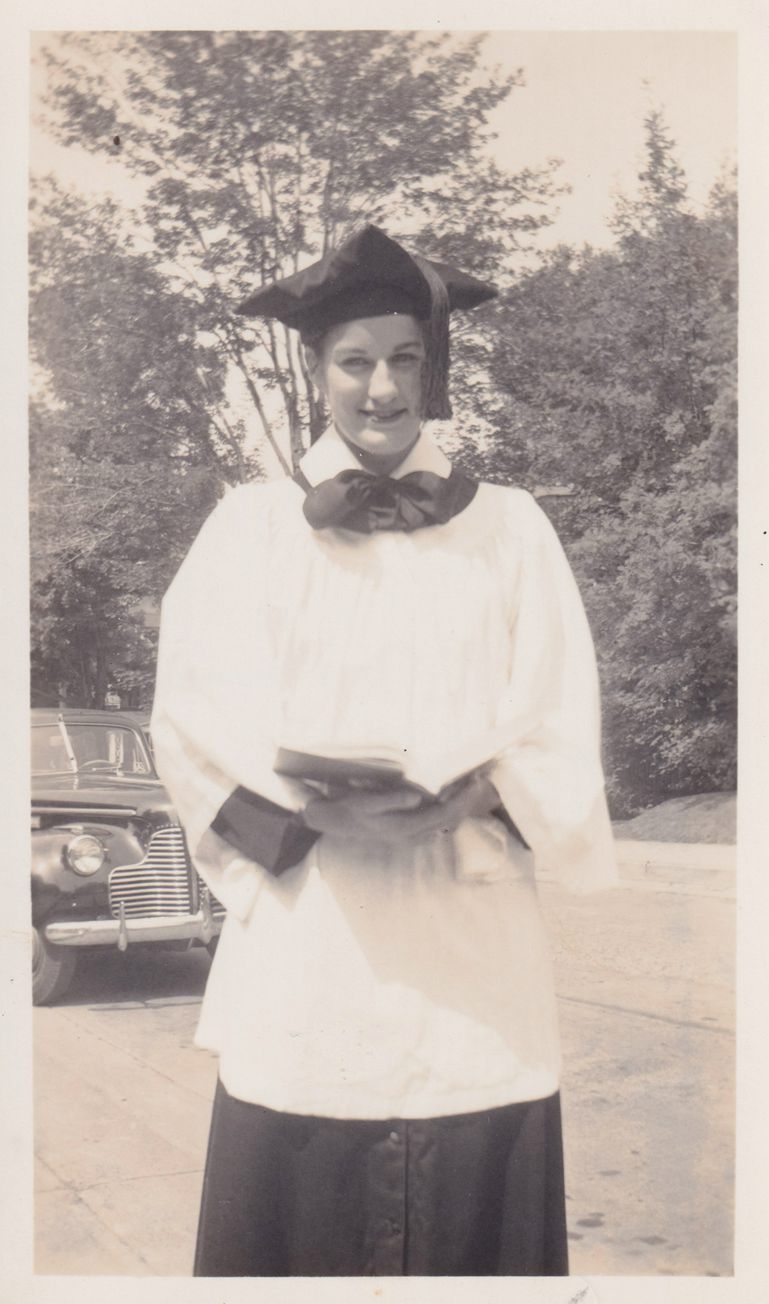 Black-and-White photograph of an unidentified woman in a cap and robe, likely a choir ensemble. She is holding a book open in front of her. The photograph was likely printed by Kollecker's Kodak and Gift Shop.