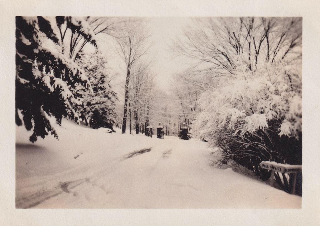 Black-and-White photograph of the road leading to one of the north gates at Trudeau Sanatorium in the snow. A small sign reading "Paul Smith's" can be seen along the road.