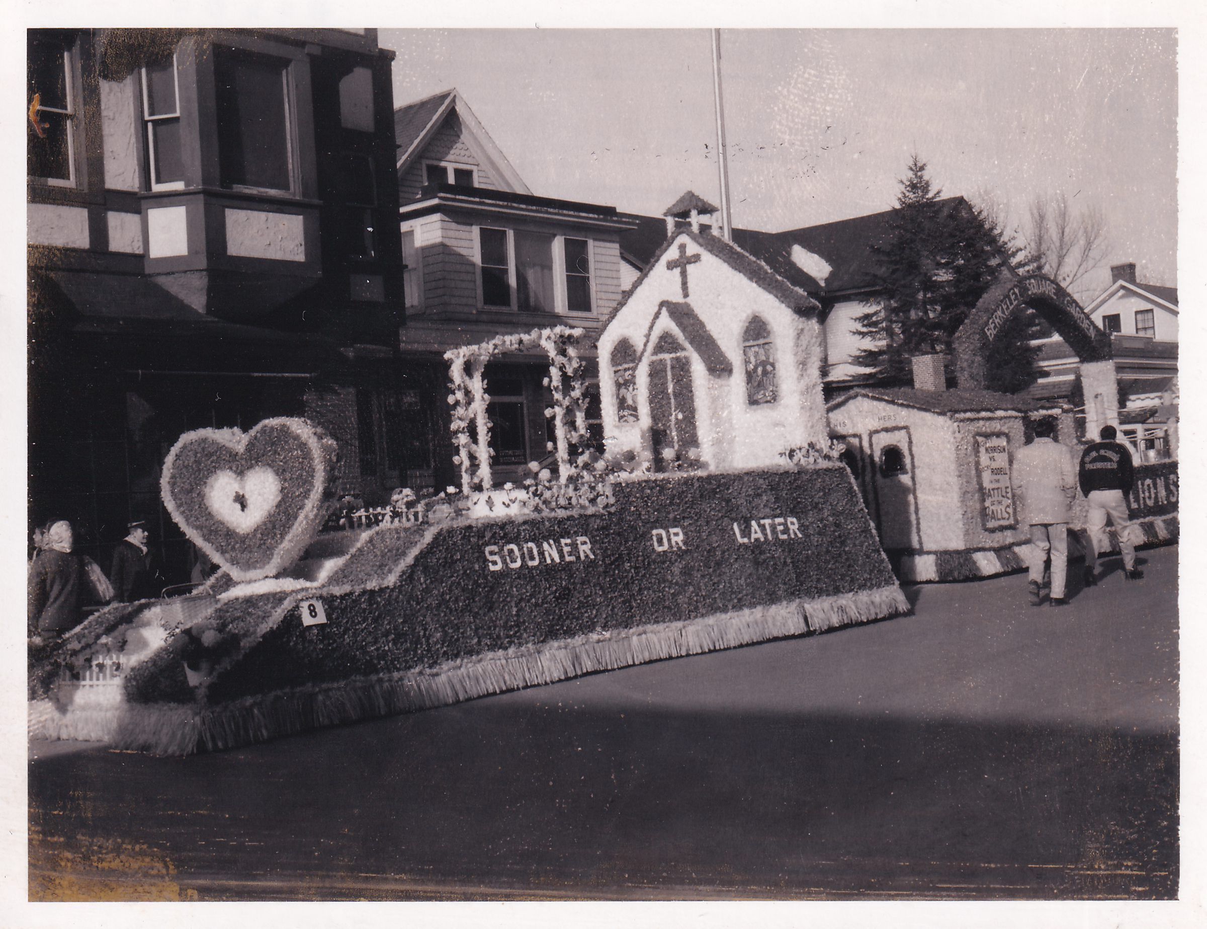 Photograph showing a "Sooner of Later" themed float in the Winter Carnival Parade on Main Street. The float has a large heart, a rose arbor, and a church or chapel structure on it. The partly-visible float parked behind it is the "Battle of the Balls" float, most likely from the Lions Club. It shows a boxing ring at "Berkeley Square Garden," with a poster for a fight between "Righy Morrison" and "Rocky Rodell." The Blue Gentian and Study and Craft Guild buildings are visible behind the floats.Made/Created