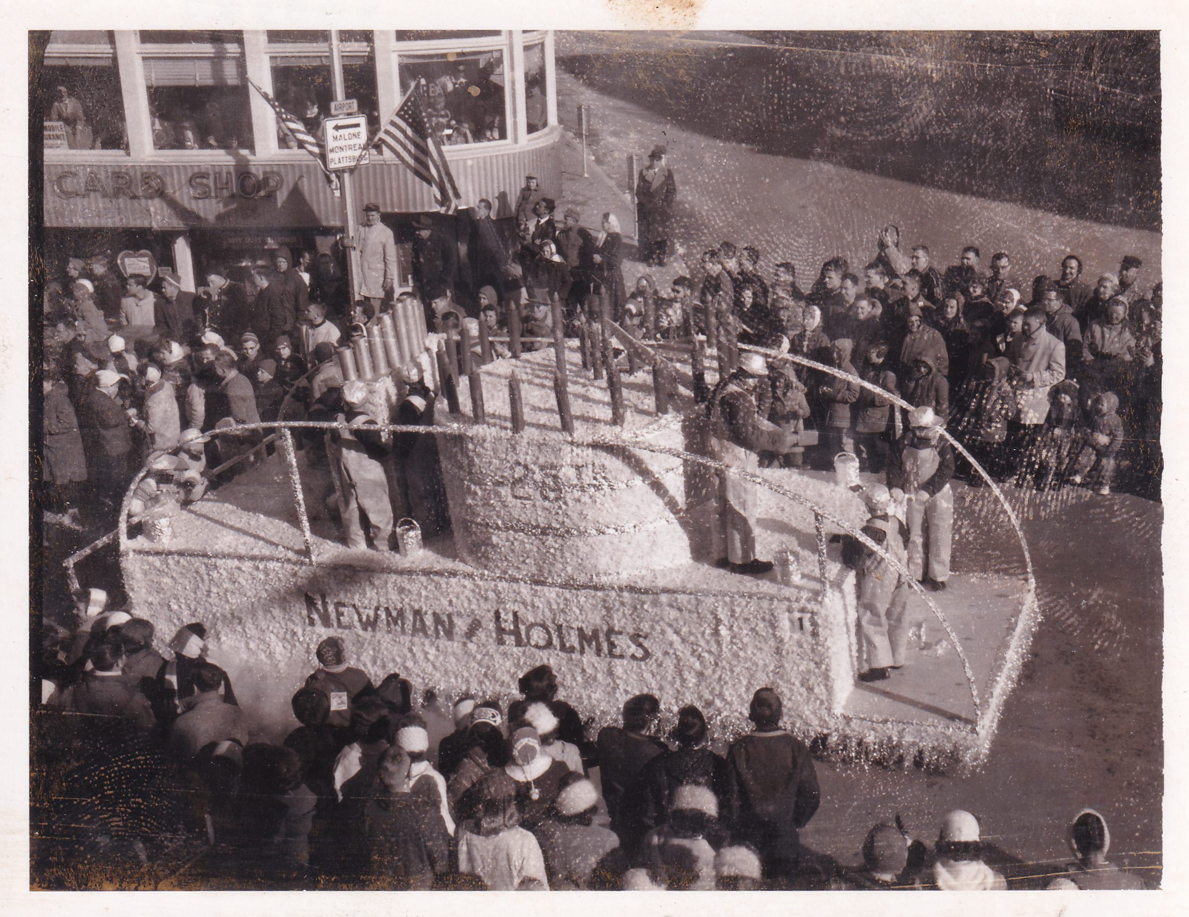 Photograph of the Newman and Holmes float in the Winter Carnival Parade on the corner of Broadway and Main Street. The float commemorates the business' 25th anniversary, and features a large cake with candles. The float riders are wearing painting coveralls and hats and appear to be building the float. People line the parade route, and the Card Shop on the first floor of the Berkeley House is visible behind them. The image is taken from an elevated location.