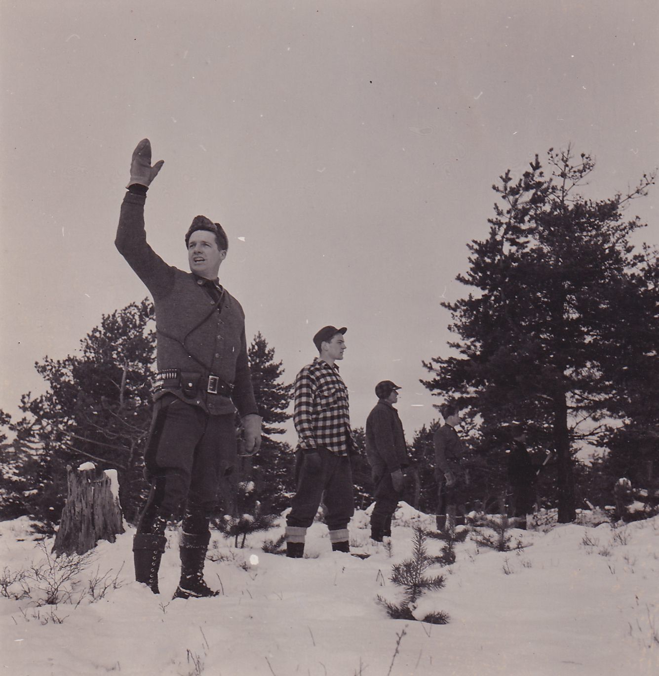Black-and-White photograph of a man in a game warden uniform standing in the snow raising his right hand and looking off camera. There are several other men in hunting gear and snowshoes standing nearby.