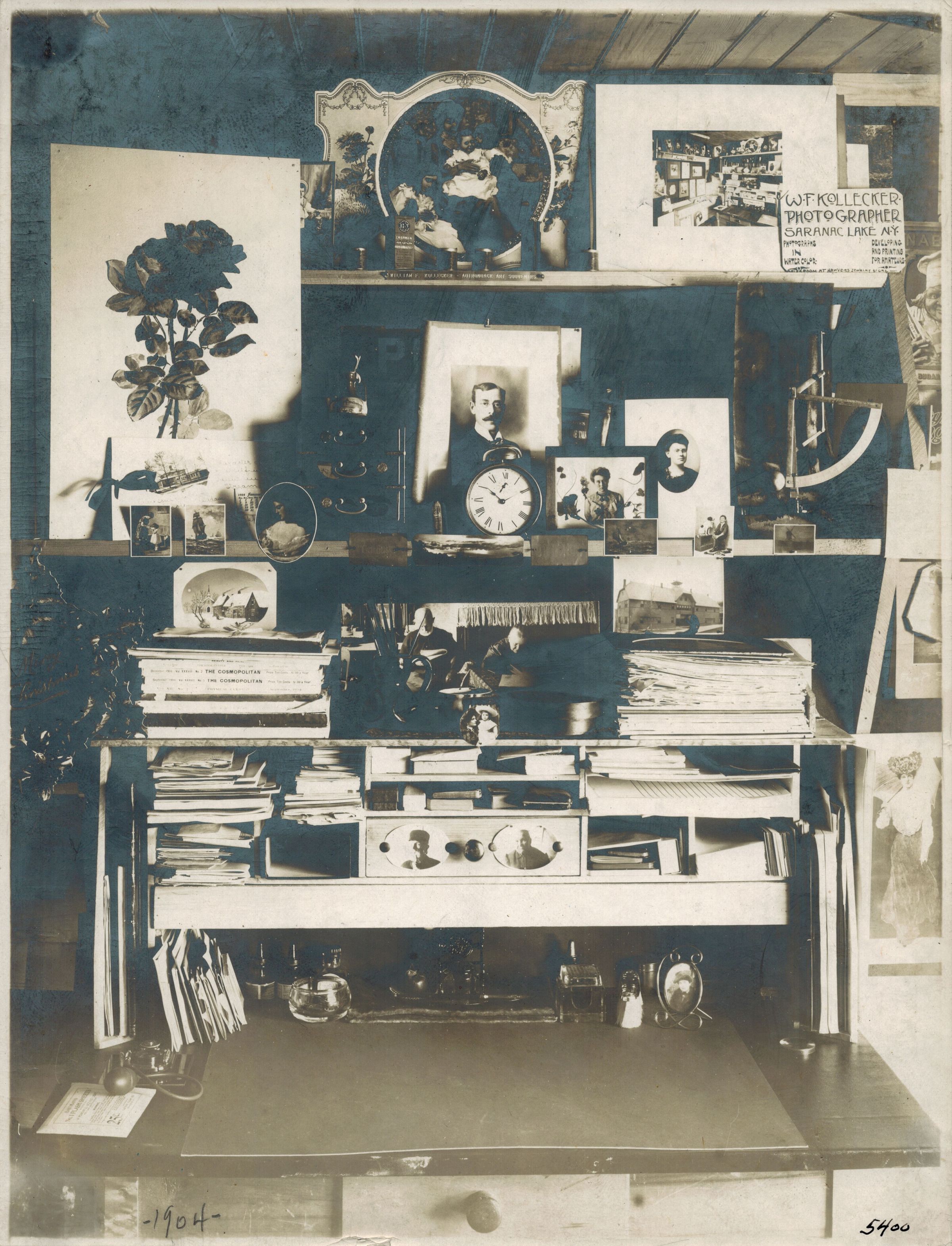 Black-and-White photograph of a desk with shelves above it. The shelves are filled with magazines, office supplies, photographs, and other items. A hand-lettered sign reading, "W. F. Kollecker, Photographer, Saranac Lake N. Y. Photographs in watercolor. Developing and printing for amateurs. Salesroom at Hawveres [?] Jewelry Store," is propped on the top shelf. Handwritten note, "1904," along bottom left edge.