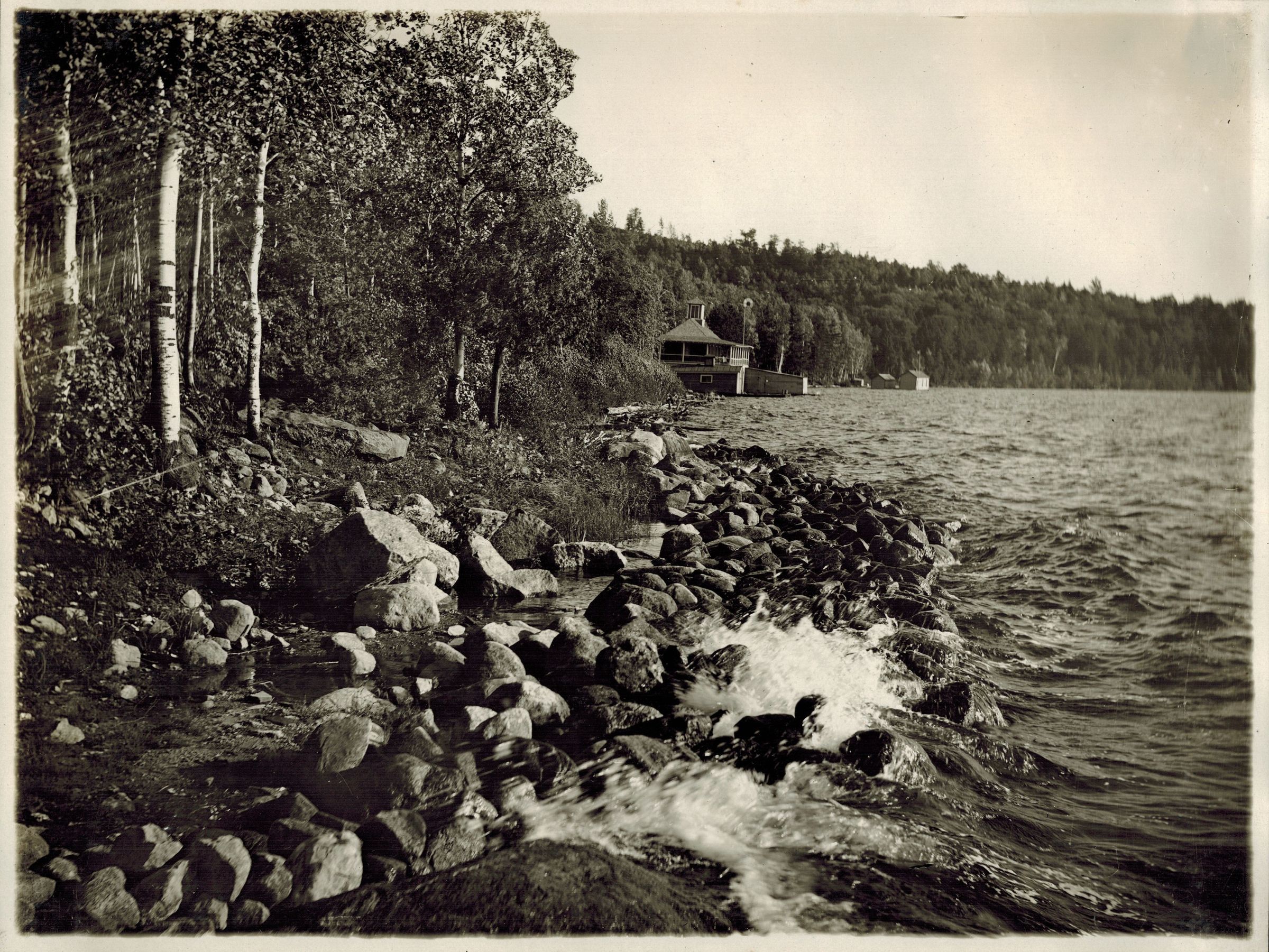 Black-and-White photograph of the shore of Lower Saranac Lake, looking left from the boathouse of the Birches. An unidentified boathouse can be seen in the distance.