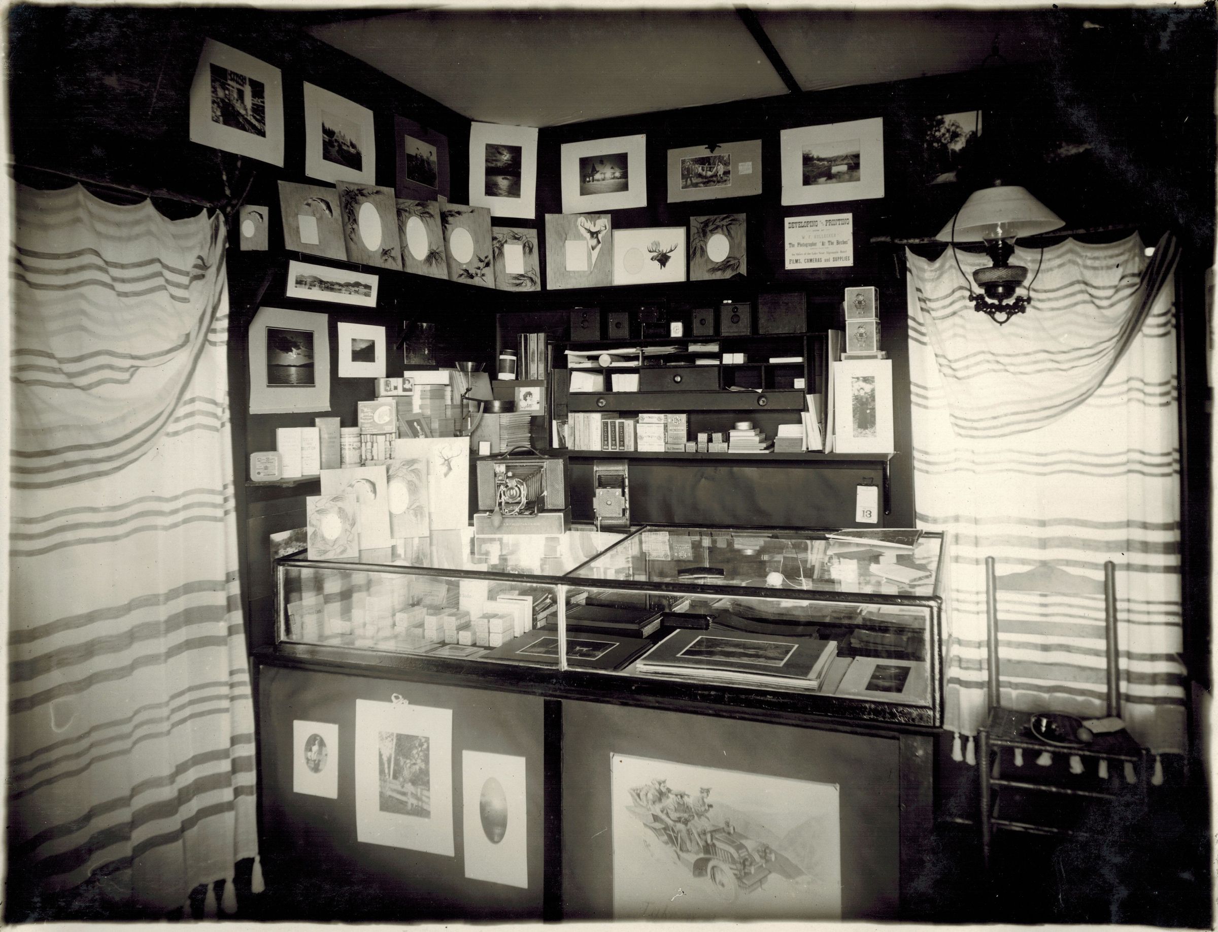 Black-and-White photograph of the interior of a small store, likely William Kollecker's shop at the Birches Camp boathouse. A glass case and shelves hold photographic supplies, prints, and frames. A sign hanging on the wall reads, "Developing and Printing done by W. F. Kollecker, The Photographer 'at The Birches.' On Shore of the Lake Near Algonquin Hotel. Films, Cameras and Supplies."