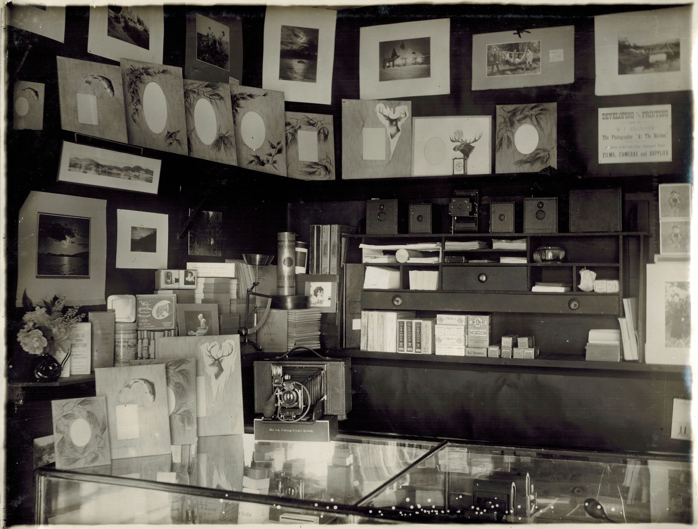 Black-and-White photograph of the interior of a small store, likely William Kollecker's shop at the Birches Camp boathouse. Shelves hold photographic supplies, prints, and frames. A sign hanging on the wall reads, "Developing and Printing done by W. F. Kollecker, The Photographer 'at The Birches.' On Shore of the Lake Near Algonquin Hotel. Films, Cameras and Supplies."