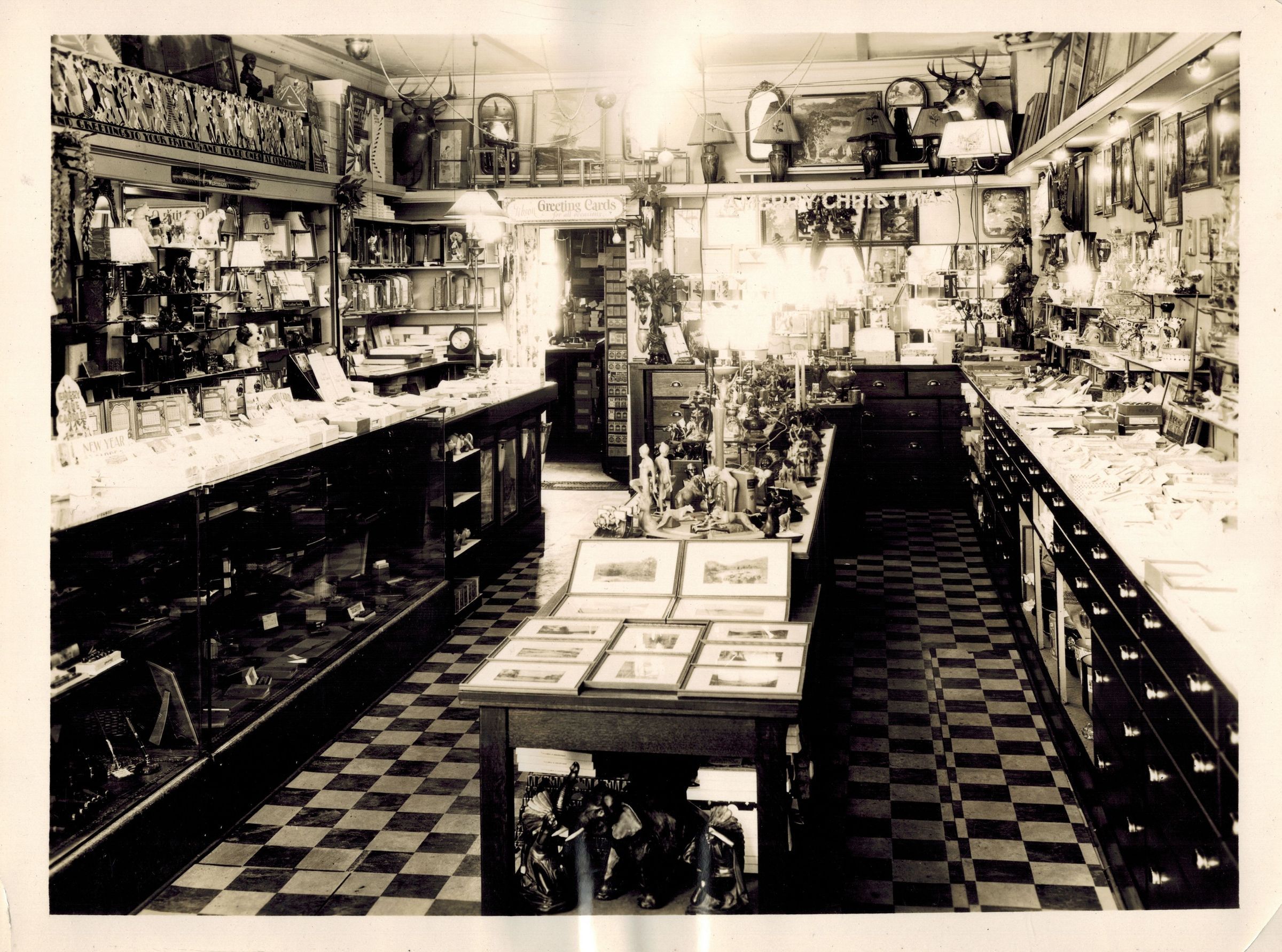 Black-and-White photograph of the interior of William Kollecker's Kodak and Gift Shop on in the larger center section of the Coulter Block. Counters line the room, and the store is filled with photographic prints, supplies, frames, vases, and other items. A banner reading, "A Merry Christmas," is strung across the back of the room.