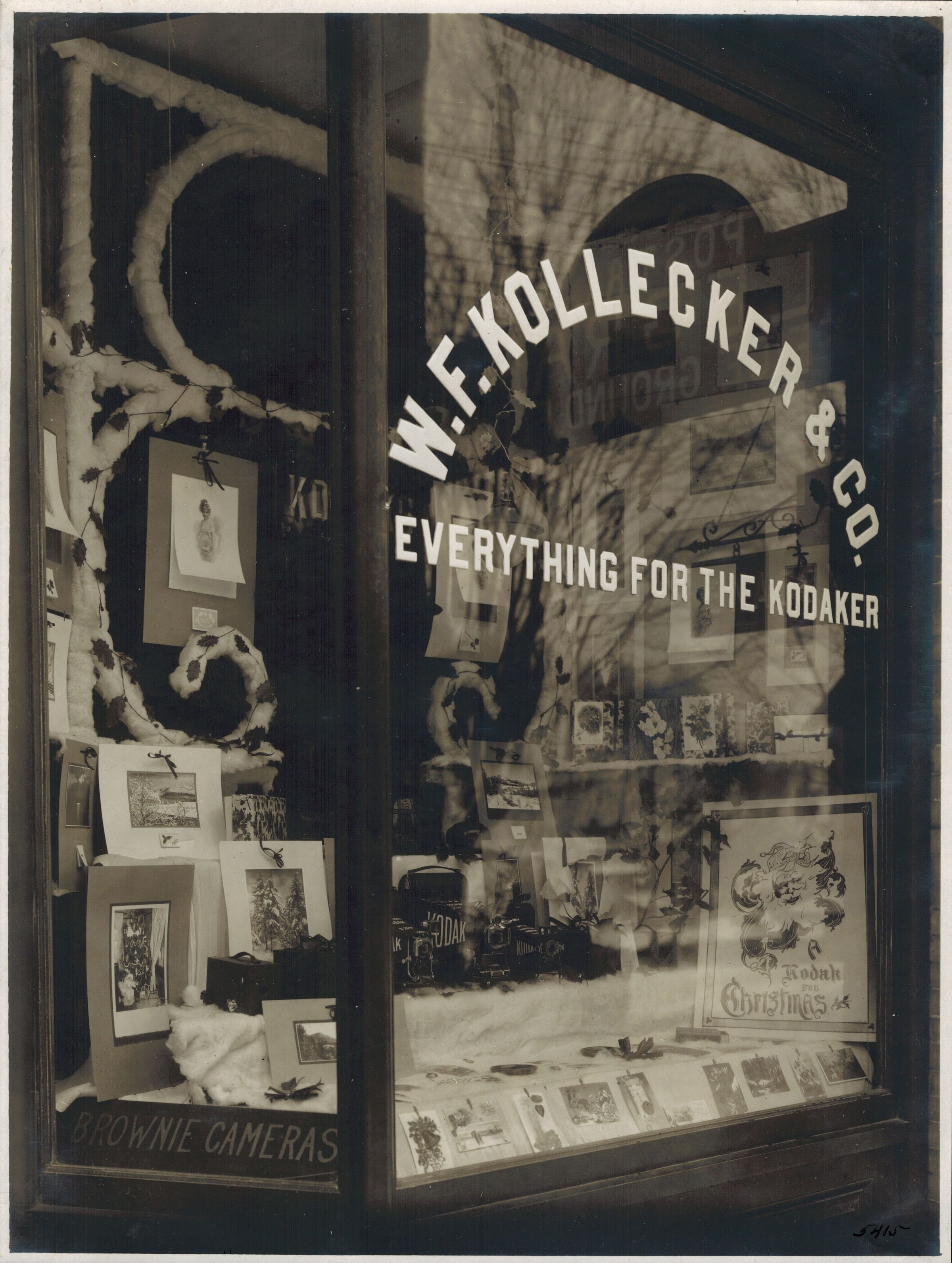 Black-and-White photograph of the front window of William Kollecker's Kodak and Gift Shop on Main Street. The store is in the smaller right-hand section of the Coulter Block. "W. F. Kollecker & Co. Everything for the Kodaker," is painted on the window. A sign in window reads, "A Kodak for Christmas" and the display includes photographic prints, calendars, cameras, and Christmas cards.