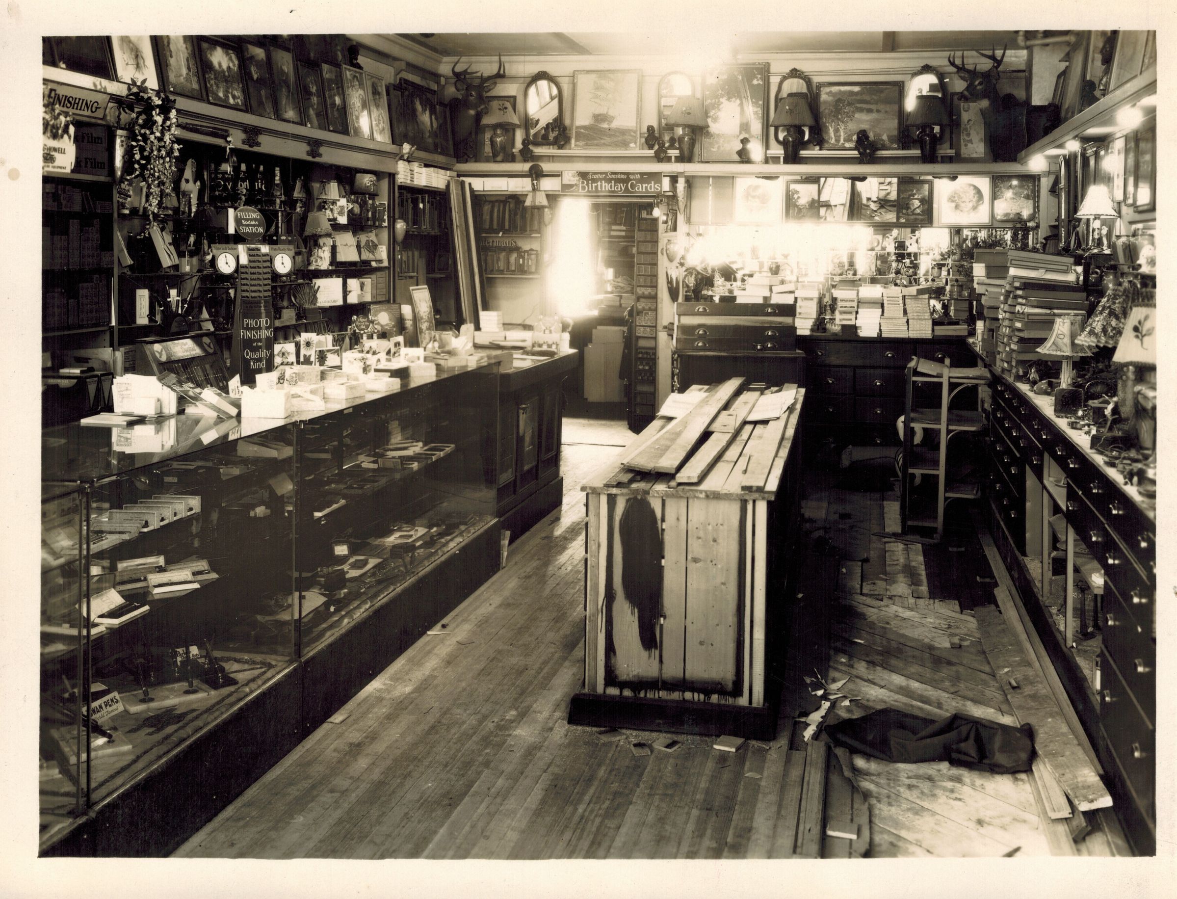 Black-and-White photograph of the interior of Kollecker's Kodak and Gift shop, inside the larger center section of the Coulter Block. The room is ringed with counters, with displays of photographic equipment, prints, calendars, postcards, gifts, and other objects packed into the space. A portion of the floor at the right-hand of the space has been pulled up and the center island is covered in planks.