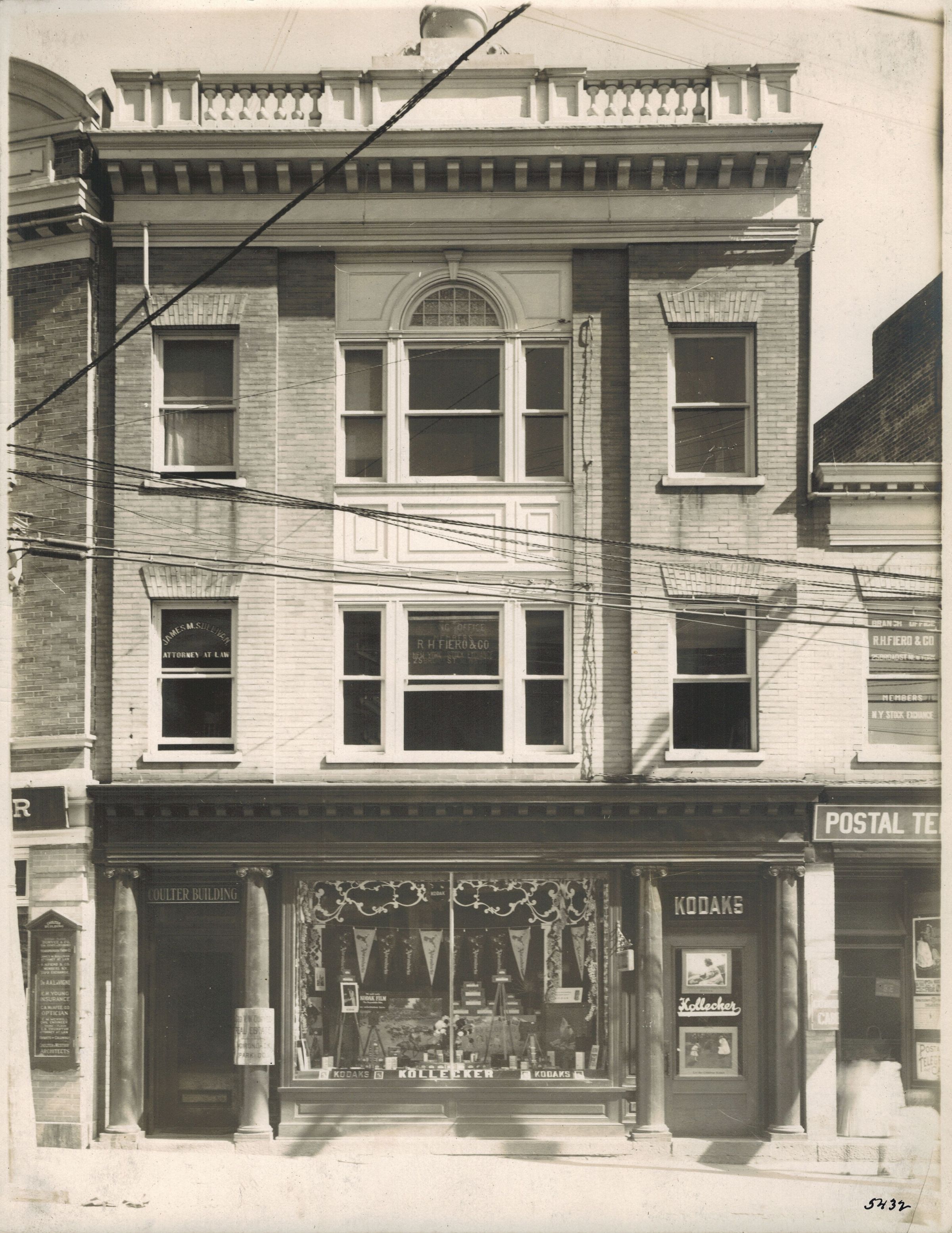 Black-and-White photograph of the display window at Kollecker's Kodak and Gift Shop, located in the larger center section of the Coulter Block. The display is decorated with felt pennants, cameras, photographic supplies, and other items. Other signs on the building read, "Geo. V. W. [?], Real Estate," "Adirondack Park [?]," "James M. Sullivan, Attorney at Law," and "R. H. Fiero & Co." See 2020.9.1.30 for closer view of window display.