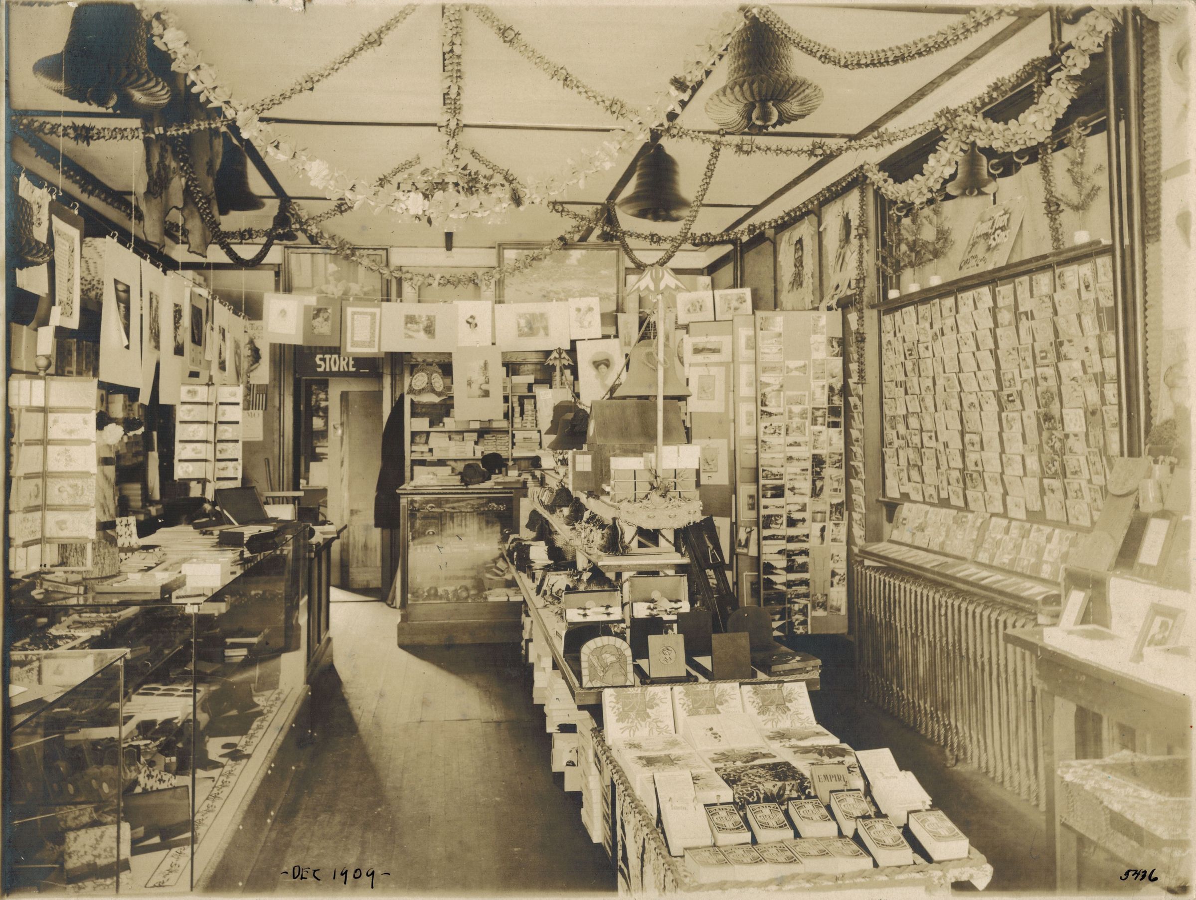 Black-and-White photograph of the interior of William Kollecker's Kodak and Gift Shop in the larger center section of the Coulter Block. Counters line the room, and the store is filled with photographic prints, supplies, frames, postcards, and other items. The store is decorated with paper garlands, bells, and other Christmas decorations. A handwritten note at the bottom reads, "Dec 1909."