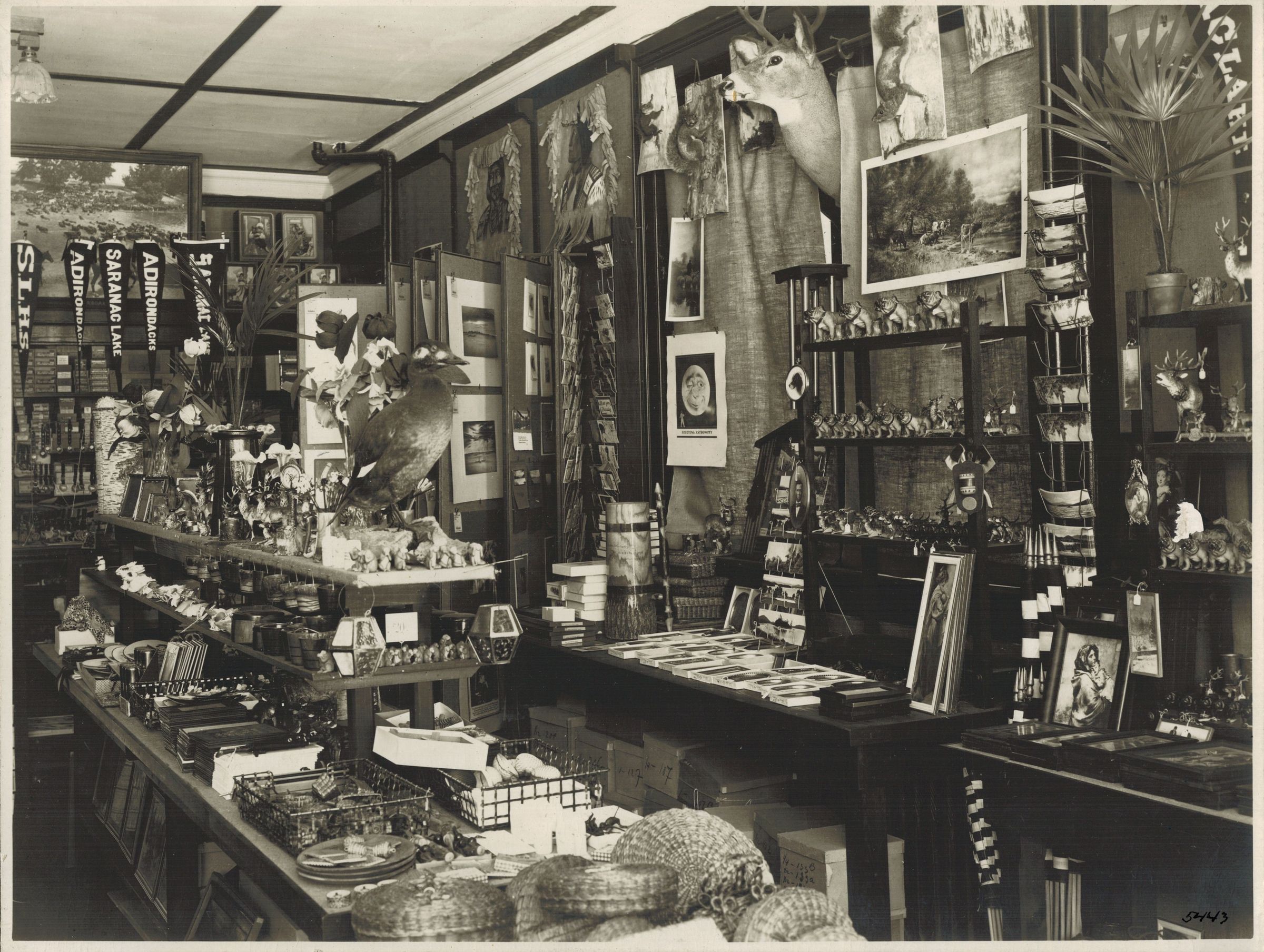 Black-and-White photograph of the interior of William Kollecker's Kodak and Gift Shop in the larger center section of the Coulter Block. Counters line the room, and the store is filled with photographic prints, supplies, frames, postcards, baskets, felt pennants, knickknacks, and other items. There are a number of taxidermy mounts and animal-themed gifts on the shelves as well.
