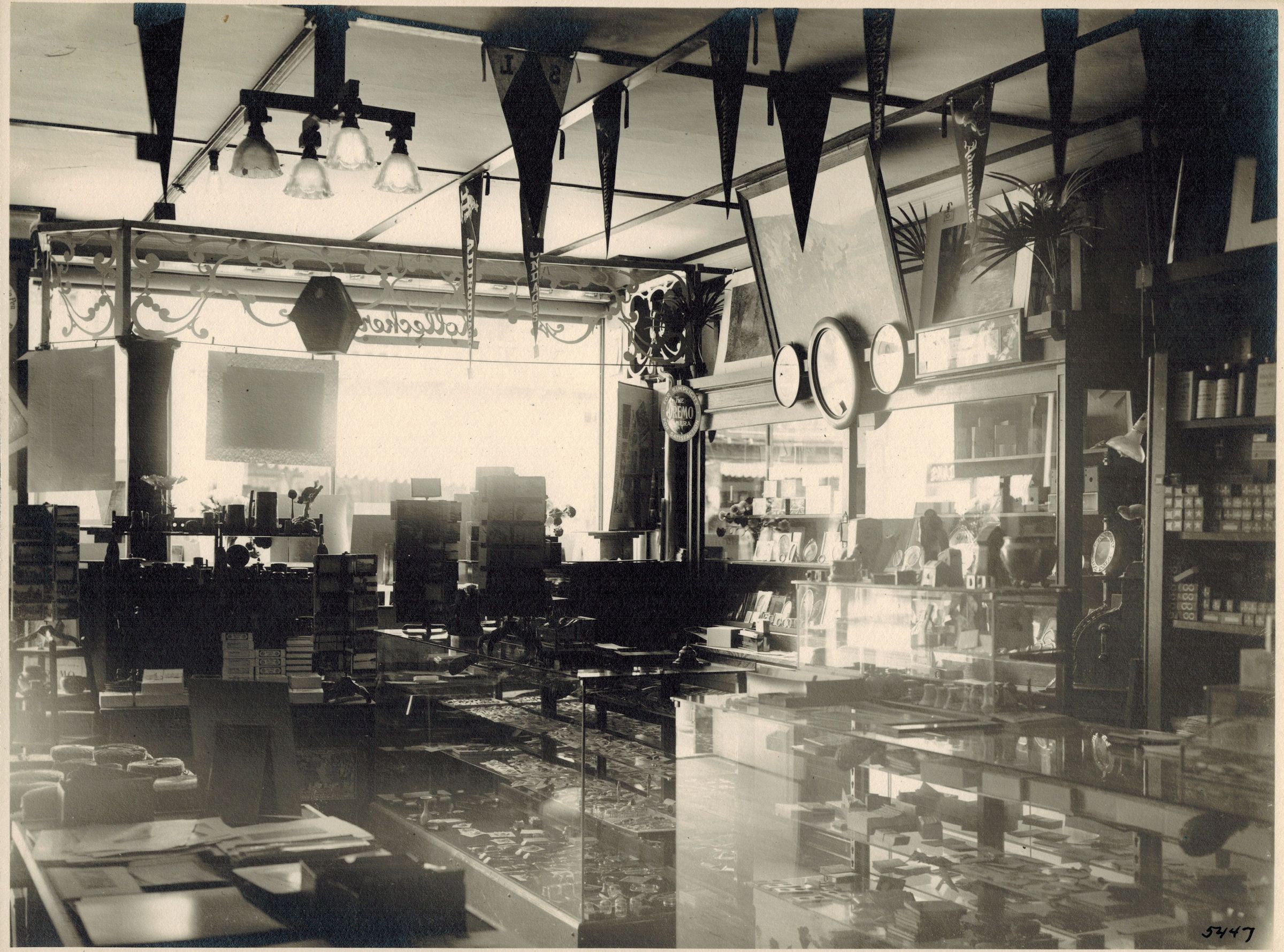 Black-and-White photograph of the interior of William Kollecker's Kodak and Gift Shop in the larger center section of the Coulter Block. The photograph was taken looking toward the window on Main Street. Counters line the room, and the store is filled with photographic prints, supplies, frames, postcards, felt pennants, and other items.